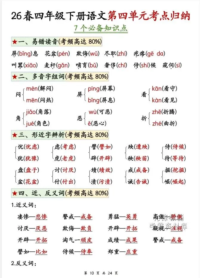 今天给大家整理了2026新四年级下册语文第四单元考点归纳+空白,转发给朋友或班级群,受益更多人,帮助孩子学习!