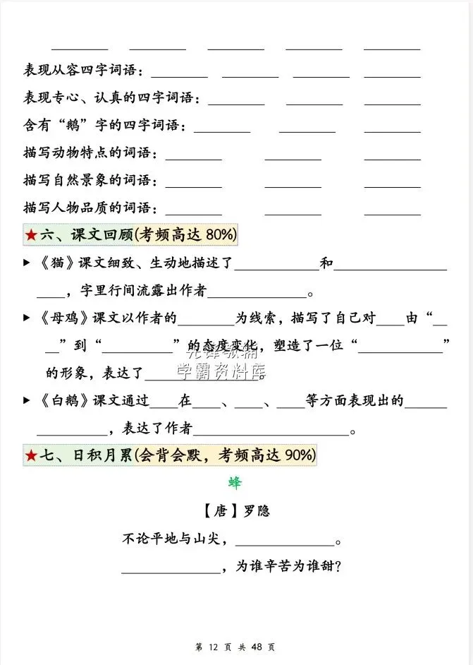 文末免费下载|2026新四年级下册语文第四单元考点归纳+空白