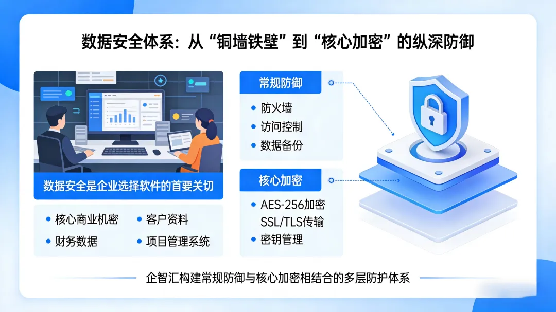 数据安全是企业选择软件时的首要关切,尤其是涉及核心商业机密、客户资料、财务数据的项目管理系统。企智汇在数据安全方面构建了常规防御与核心加密相结合的多层防护体系。