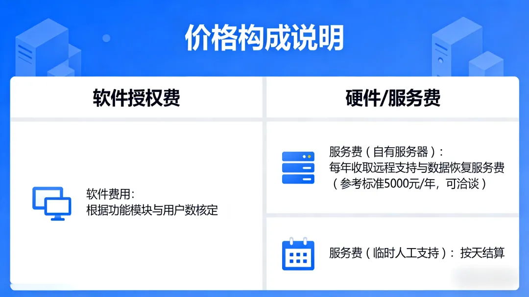 服务费:若客户使用自有服务器,每年收取一定数额的远程支持与数据恢复服务费(参考标准5000元/年,可洽谈)。若临时需要额外的人工支持,则按天结算。