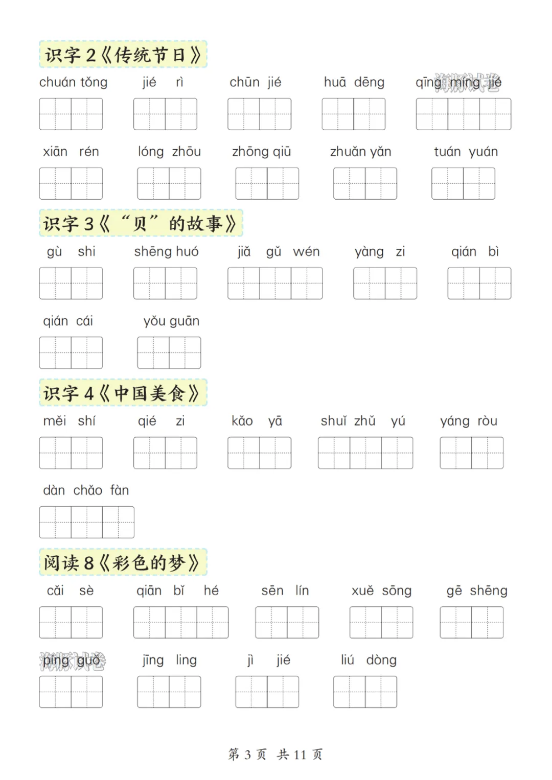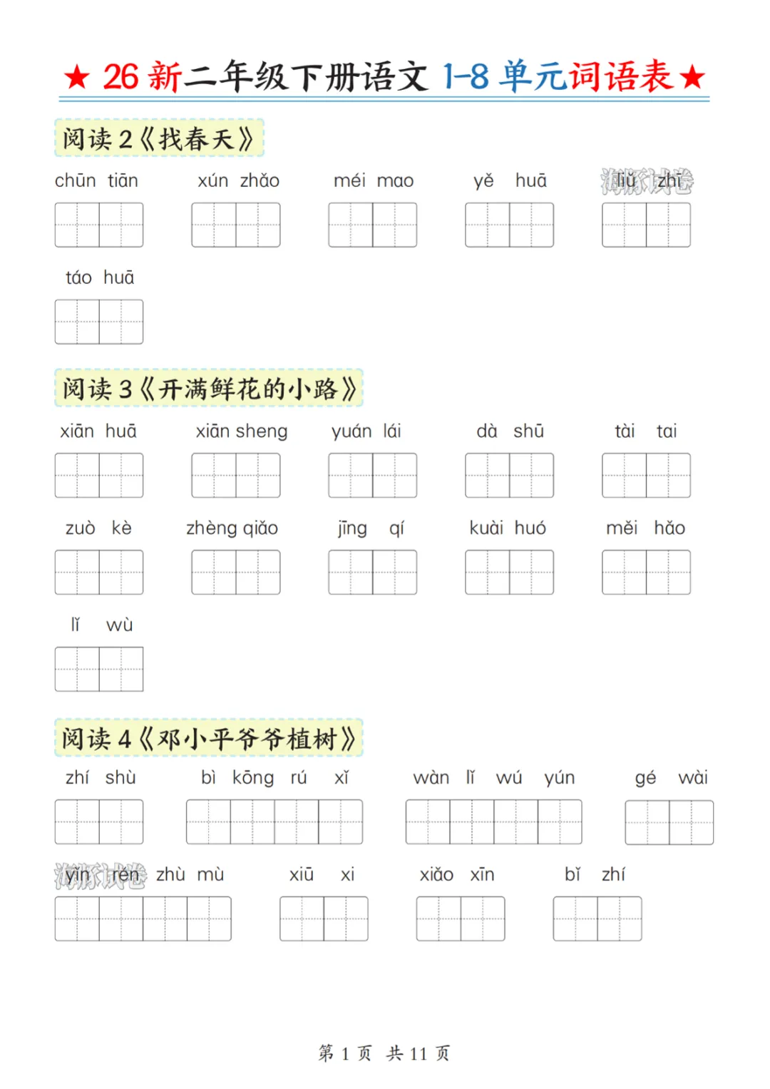二年级(下)语文1-8单元词语表 电子版可打印