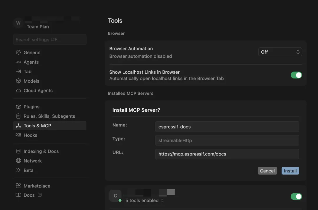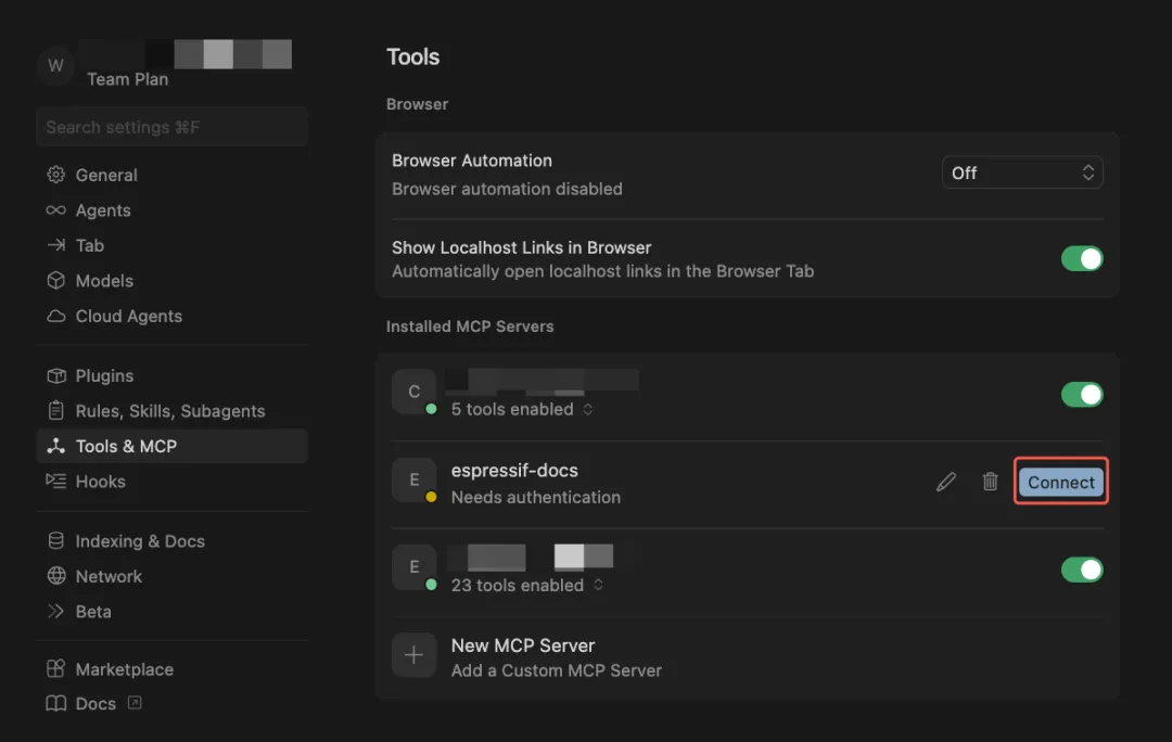 Cursor:进入 Settings > Agents > MCP Allowlist。首次调用时 Cursor 会弹窗询问,授权即可。如果没有弹窗,则手动添加工具名,例如 espressif-docs: secrch_espressif_sources。