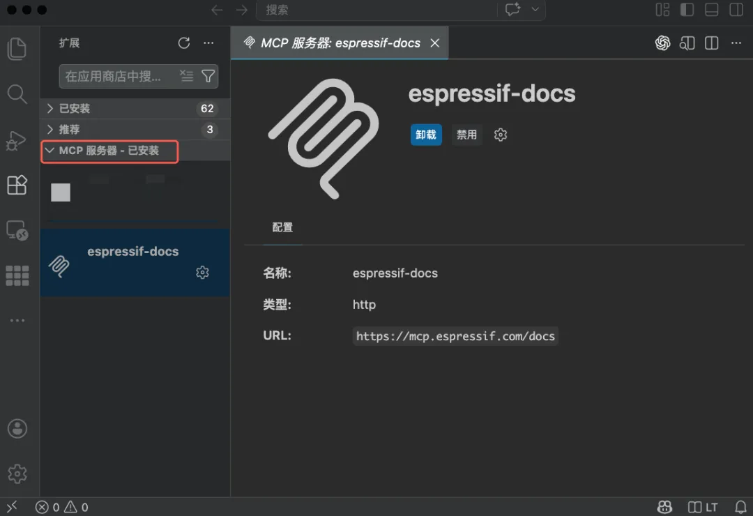 5. 验证完成后,可以在 扩展 > MCP 服务器 – 已安装 下看到已安装的 MCP 服务器。