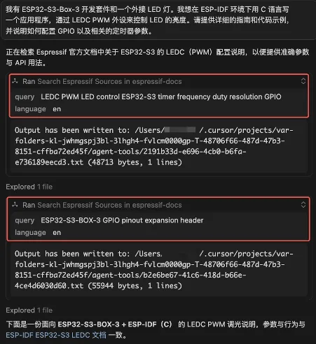 确认工具调用已触发。每次提问后,检查编辑器中是否出现了 MCP 工具调用的标识。如果没有,说明 AI Agent 可能在用训练数据或网络搜索直接作答,而不是查询乐鑫文档。