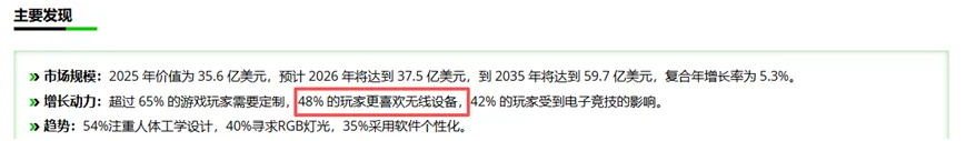(2)进一步,根据Global Growth Insights网站发布的:“PC 游戏外设市场规模、份额、增长和行业分析中:其中48%的玩家更喜欢无线设备。”[2]