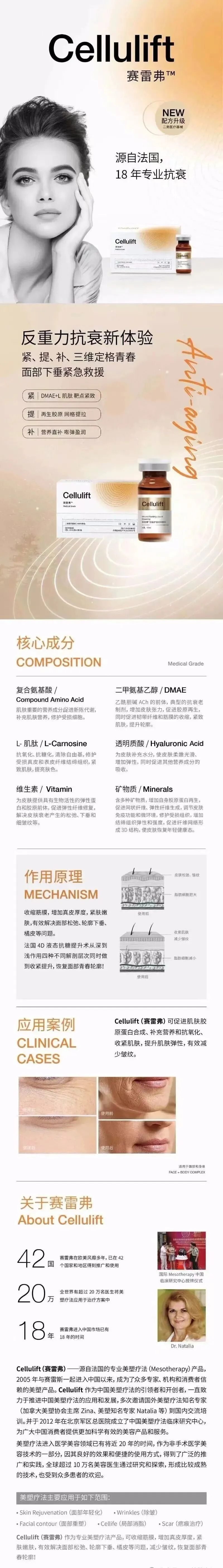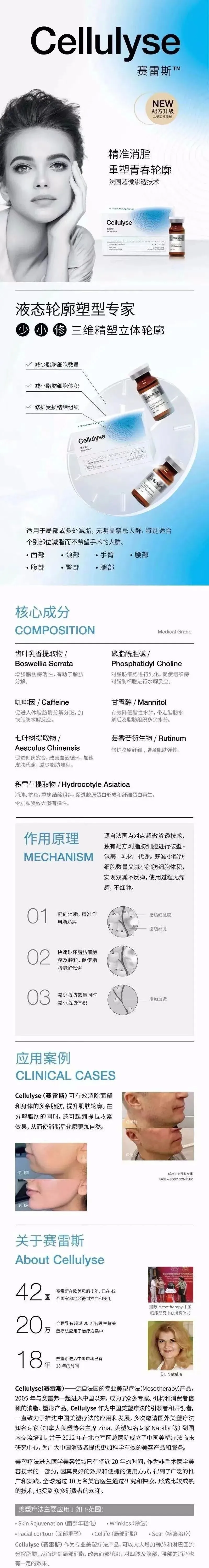 Cellulyse(赛雷斯)&Cellulift(赛雷弗)—源自法国的专业美塑疗法(Mesotherapy)产品,2005年进入中国以来,成为了众多专家、机构的消费者信赖的消脂、塑形产品。赛雷斯&赛雷弗作为中国美塑疗法的引领者和开创者,一直致力于推进中国美塑疗法的应用和发展,多次邀请国外美塑疗法知名专家(加拿大美塑协会主席Zina、美塑知名专家Natalia等)到国内交流培训。并于2012年在北京军区总医院成立了中国美塑疗法临床研究中心,为广大中国消费者提供更加科学有效的美容产品和服务。