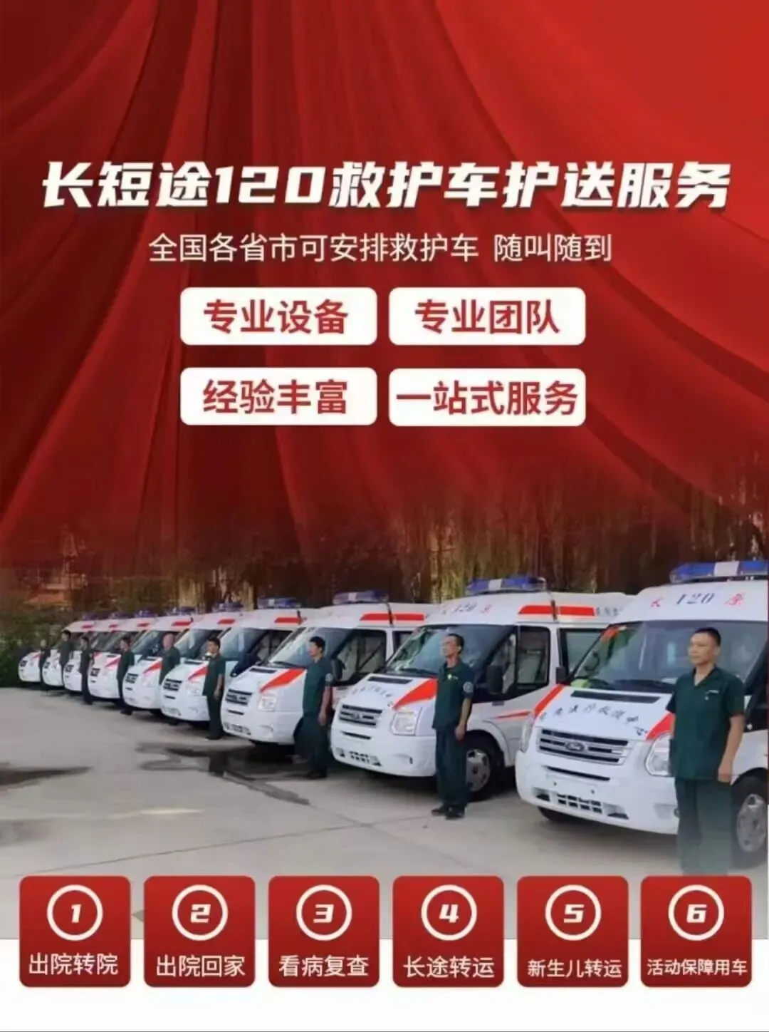 中福救护车出租转运公司,120非急救救护车接送病人预约护送。24小时为术后康复、危重患者及跨区域就医人群提供专业医疗转运服务,提供120救护车出租‖救护车转运‖私人120救护车(非急救)‖跨省长途转运‖危重病人转运‖市内转运‖术后康复病人转运‖高铁病人转运‖患者返乡‖大型活动赛事保障‖配备ICU设备:呼吸机▪心电监护仪▪吸痰器•微量泵•氧气▪急救药箱▪专业医护团队;就近派车
