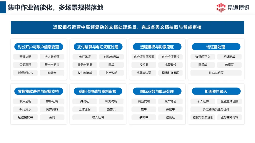 围绕这一需求,易道博识智能文档工作流 DocFlux 形成了一套覆盖采集处理、智能抽取、辅助审核的完整能力,帮助银行在提升处理效率的同时,进一步强化作业质量和运营管理能力。