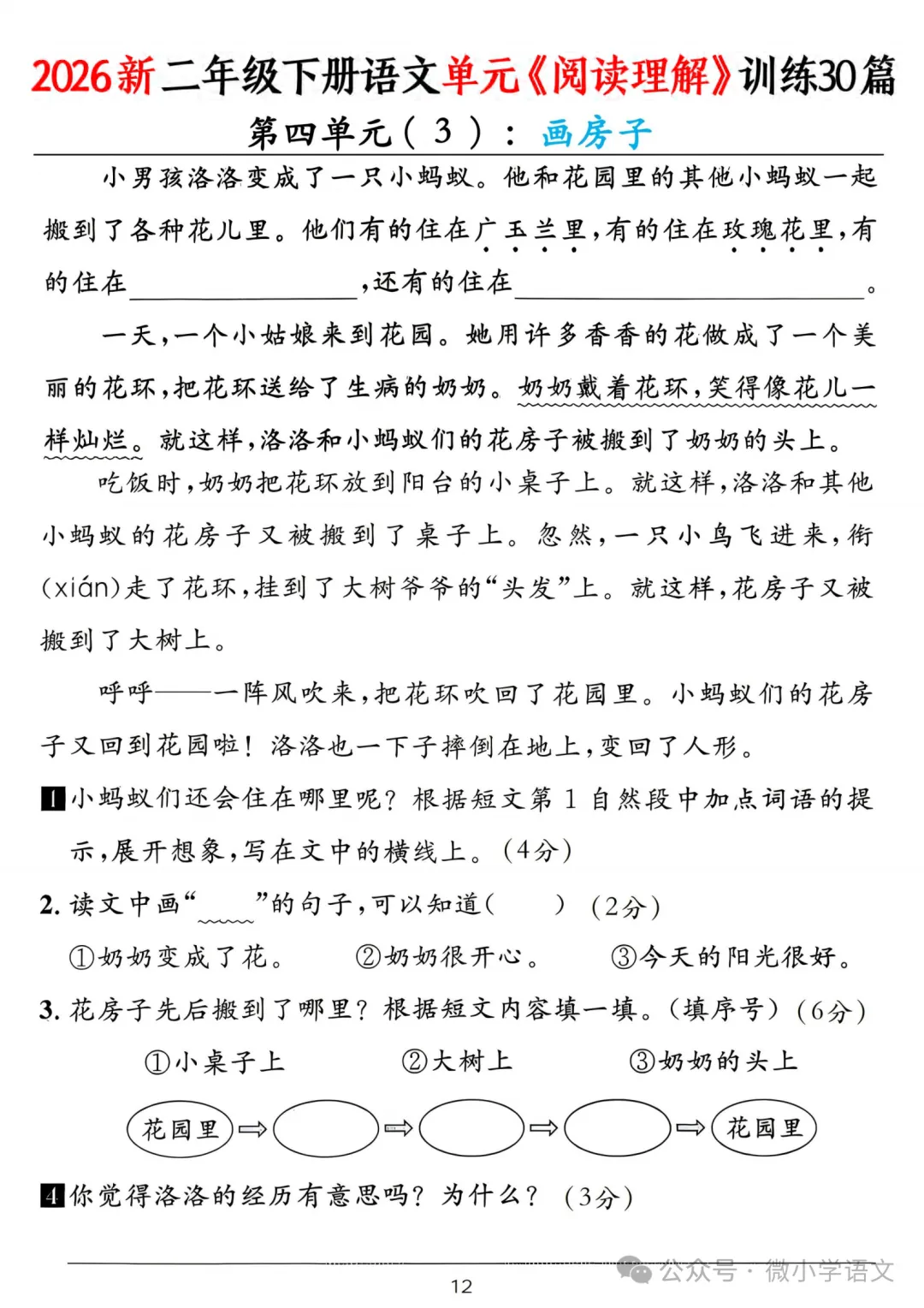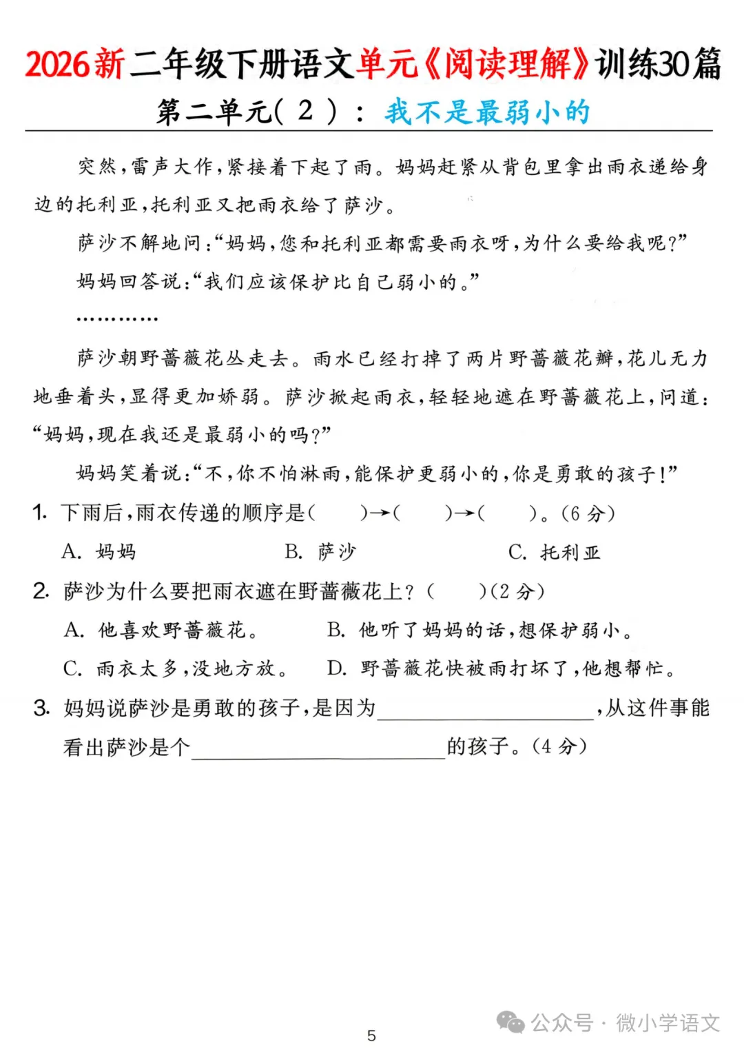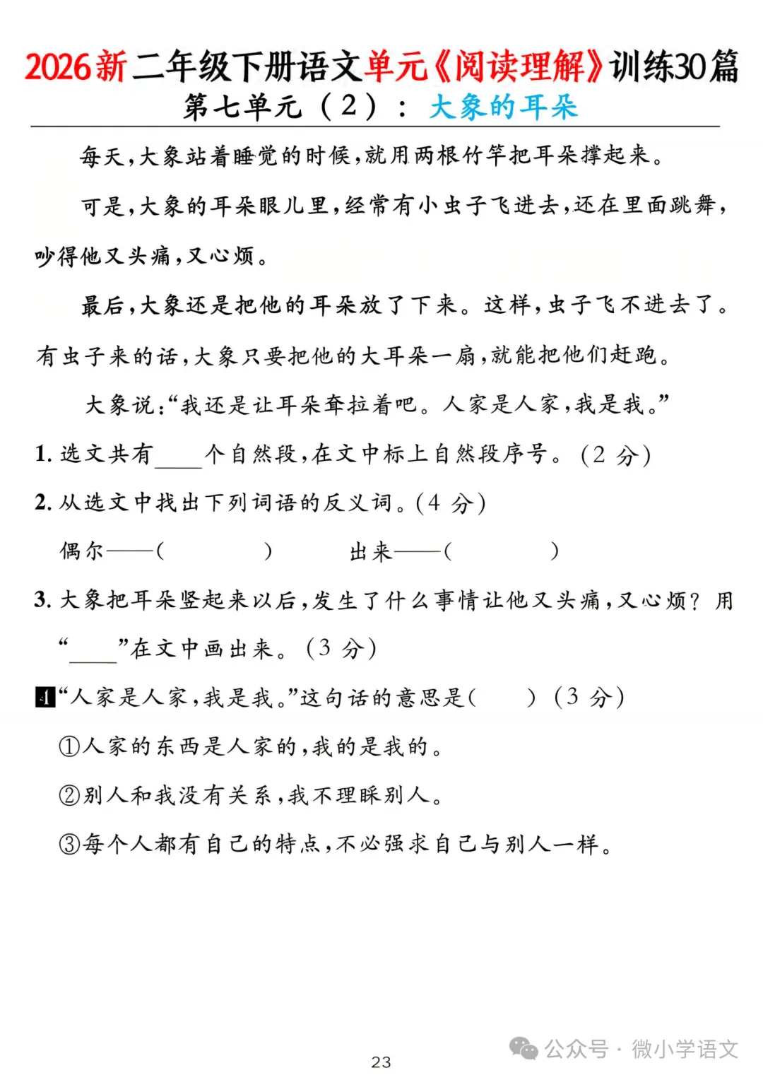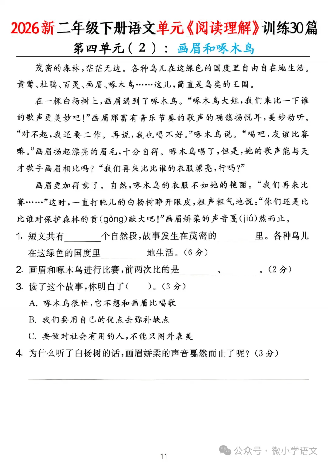 本微信公众账号分享的资源均通过网络等公共合法渠道获得,仅供试用!版权属于原出版机构或影像公司,本资源为电子载体,传播分享仅限于家庭使用与交流心得、参考和辅助购买决策,不得以任何理由在商业行为中使用,若喜欢此资源,建议购买实体产品。文章中的视频及图片均来自网络,版权归原作者或原出版社所有。如有侵权,请及时联系删除。#二年级语文下册单元阅读理解训练