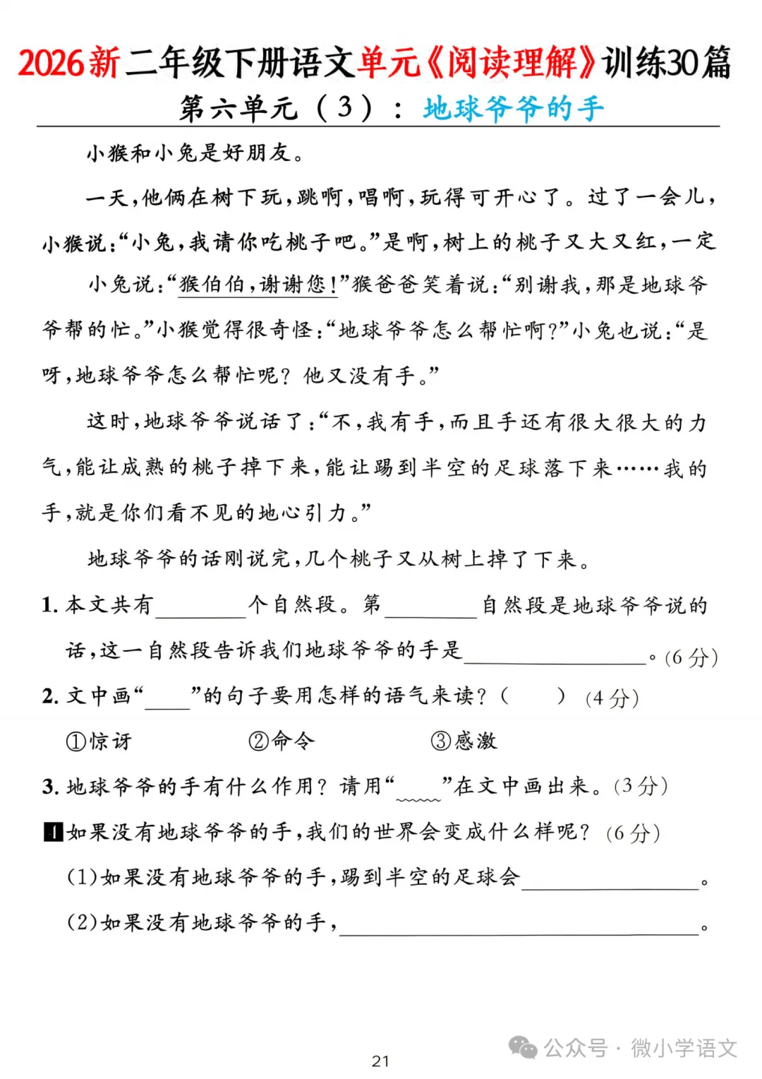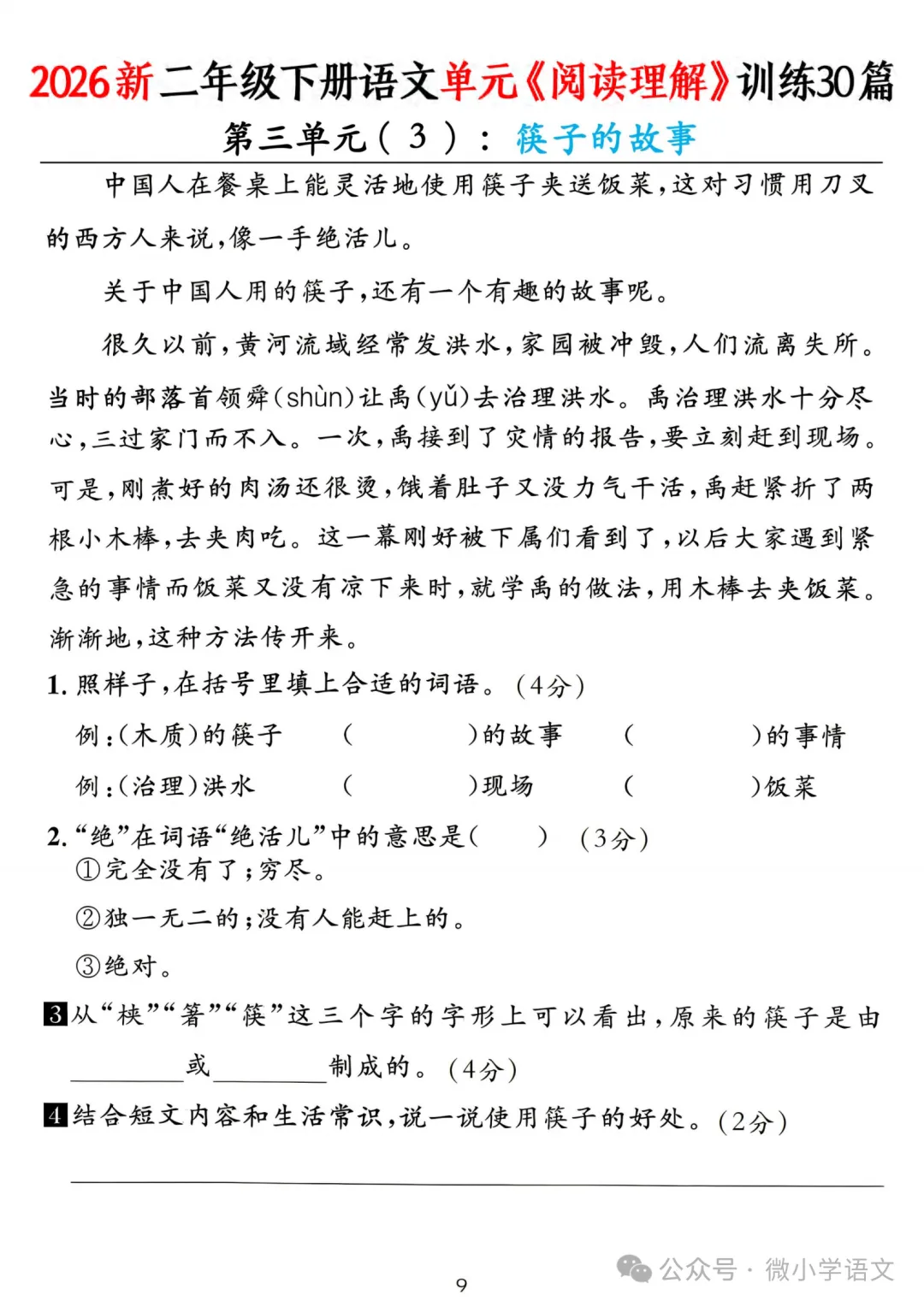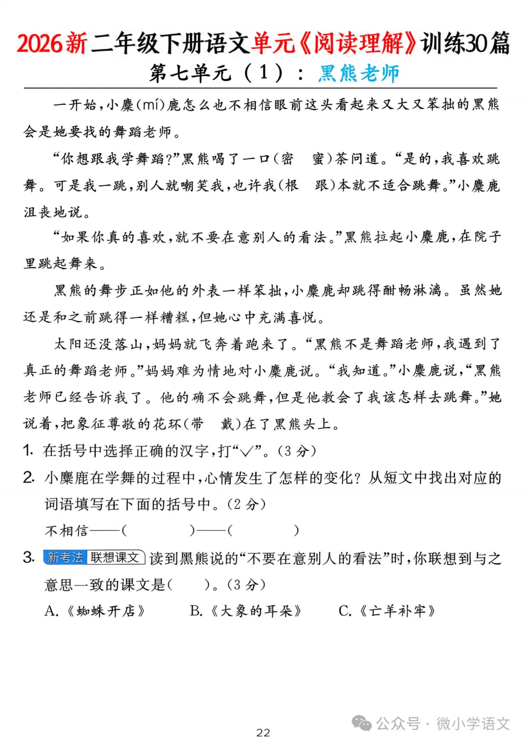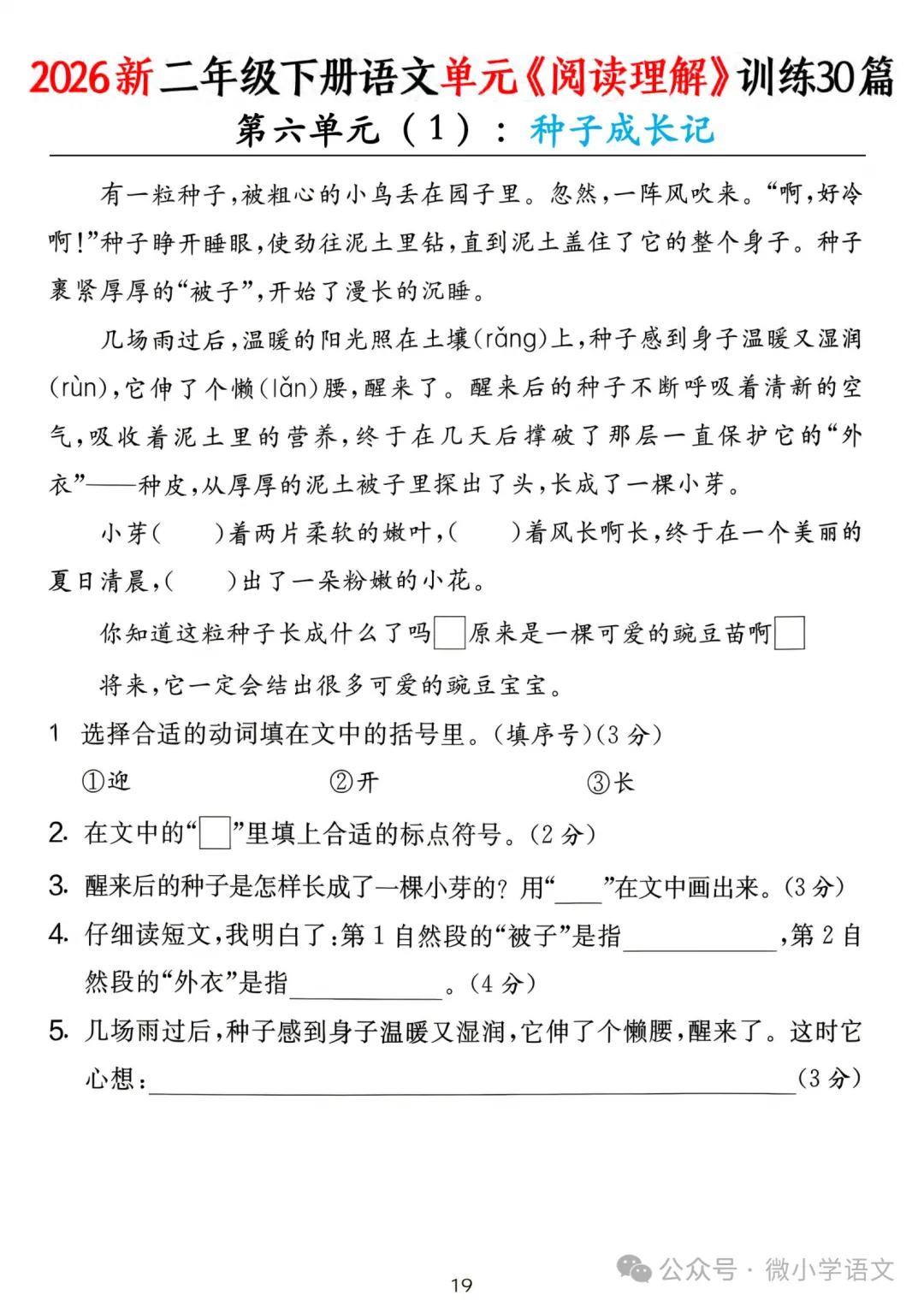 本微信公众账号分享的资源均通过网络等公共合法渠道获得,仅供试用!版权属于原出版机构或影像公司,本资源为电子载体,传播分享仅限于家庭使用与交流心得、参考和辅助购买决策,不得以任何理由在商业行为中使用,若喜欢此资源,建议购买实体产品。文章中的视频及图片均来自网络,版权归原作者或原出版社所有。如有侵权,请及时联系删除。#二年级语文下册单元阅读理解训练