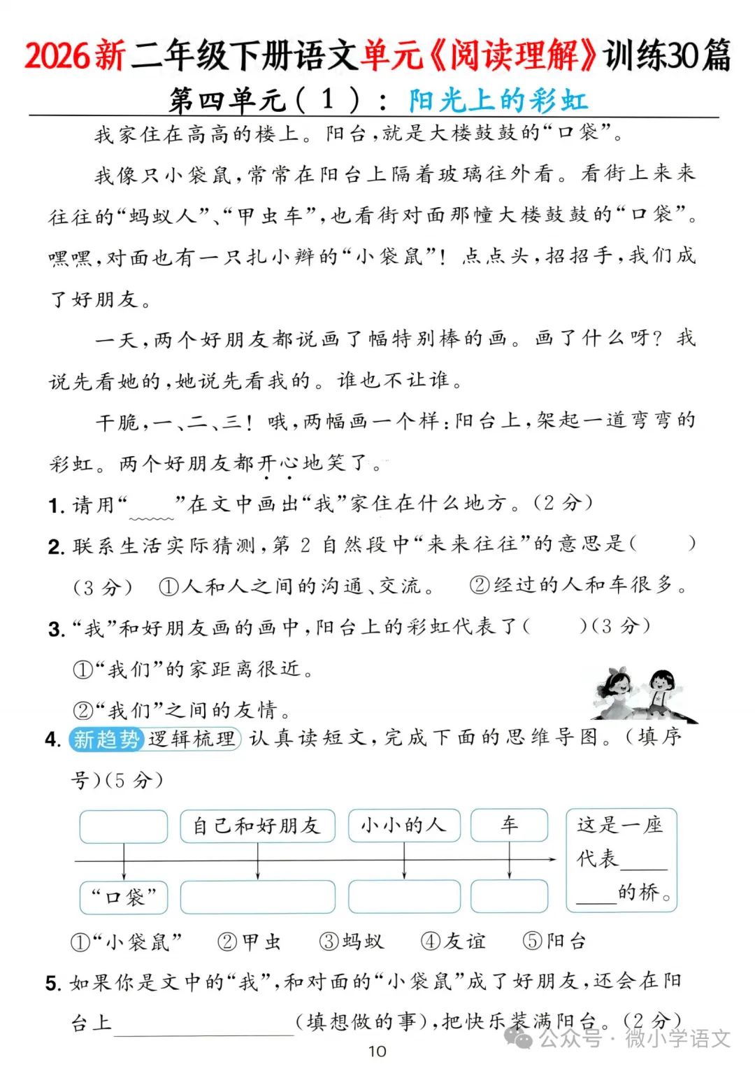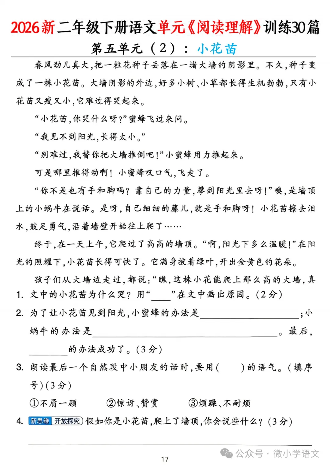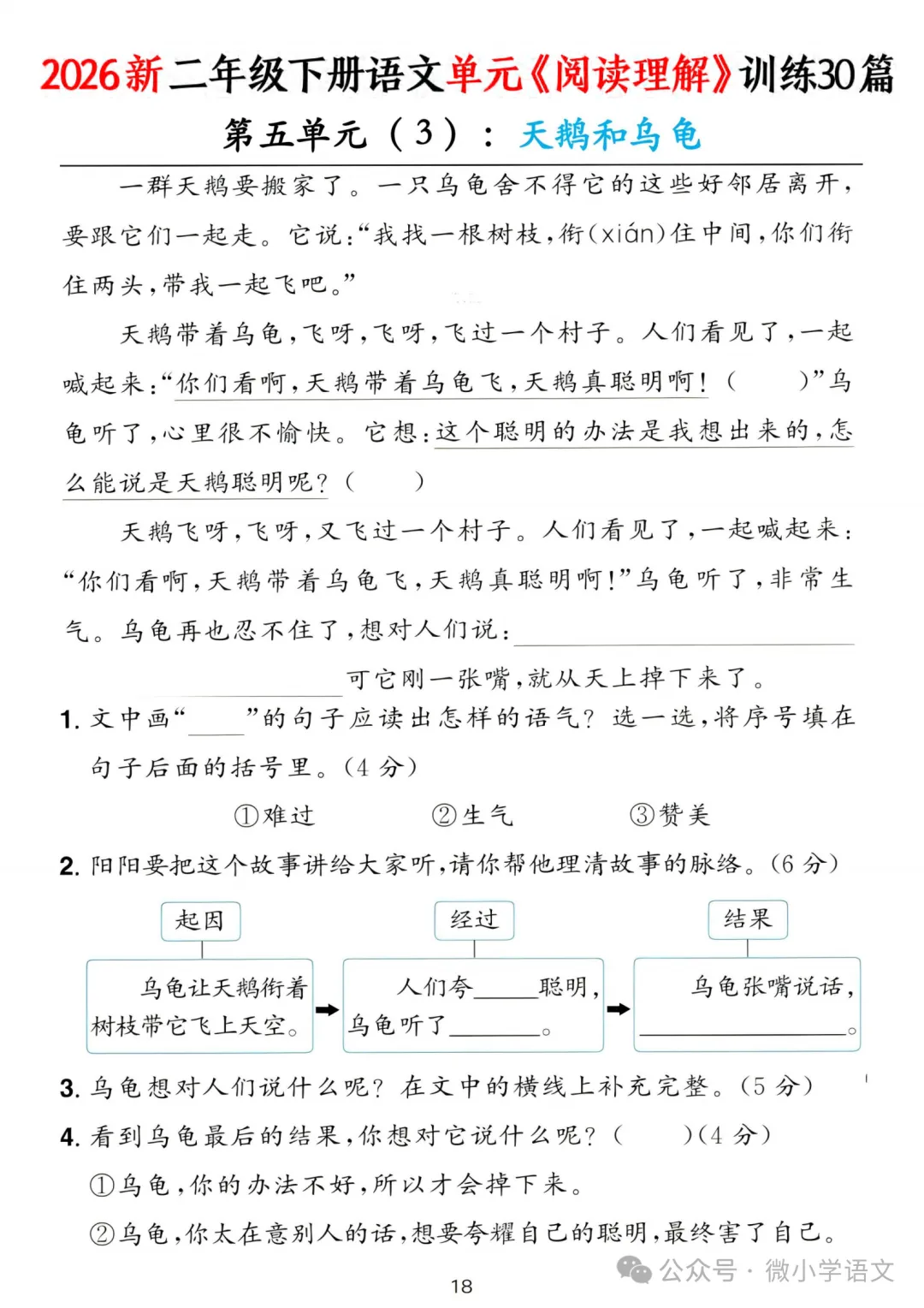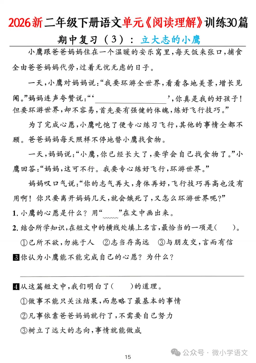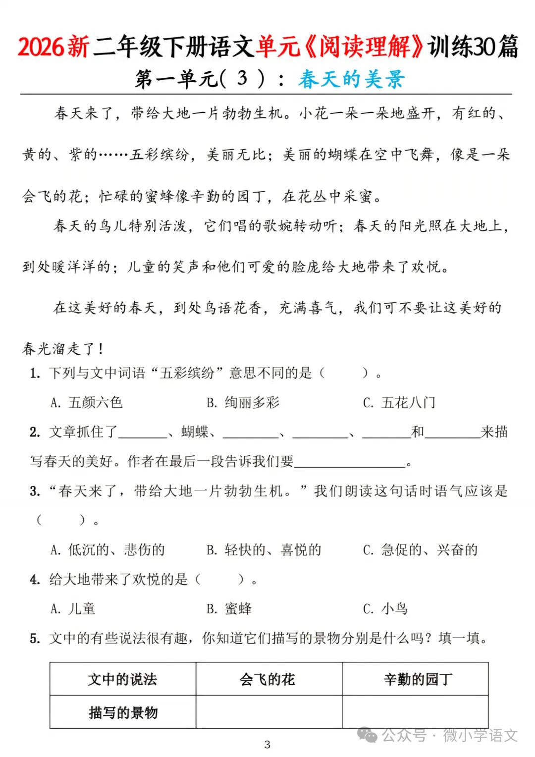 本微信公众账号分享的资源均通过网络等公共合法渠道获得,仅供试用!版权属于原出版机构或影像公司,本资源为电子载体,传播分享仅限于家庭使用与交流心得、参考和辅助购买决策,不得以任何理由在商业行为中使用,若喜欢此资源,建议购买实体产品。文章中的视频及图片均来自网络,版权归原作者或原出版社所有。如有侵权,请及时联系删除。#二年级语文下册单元阅读理解训练