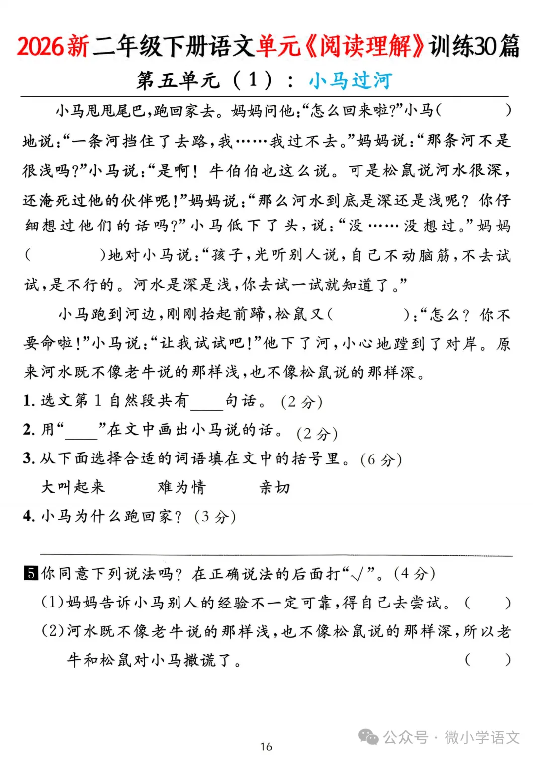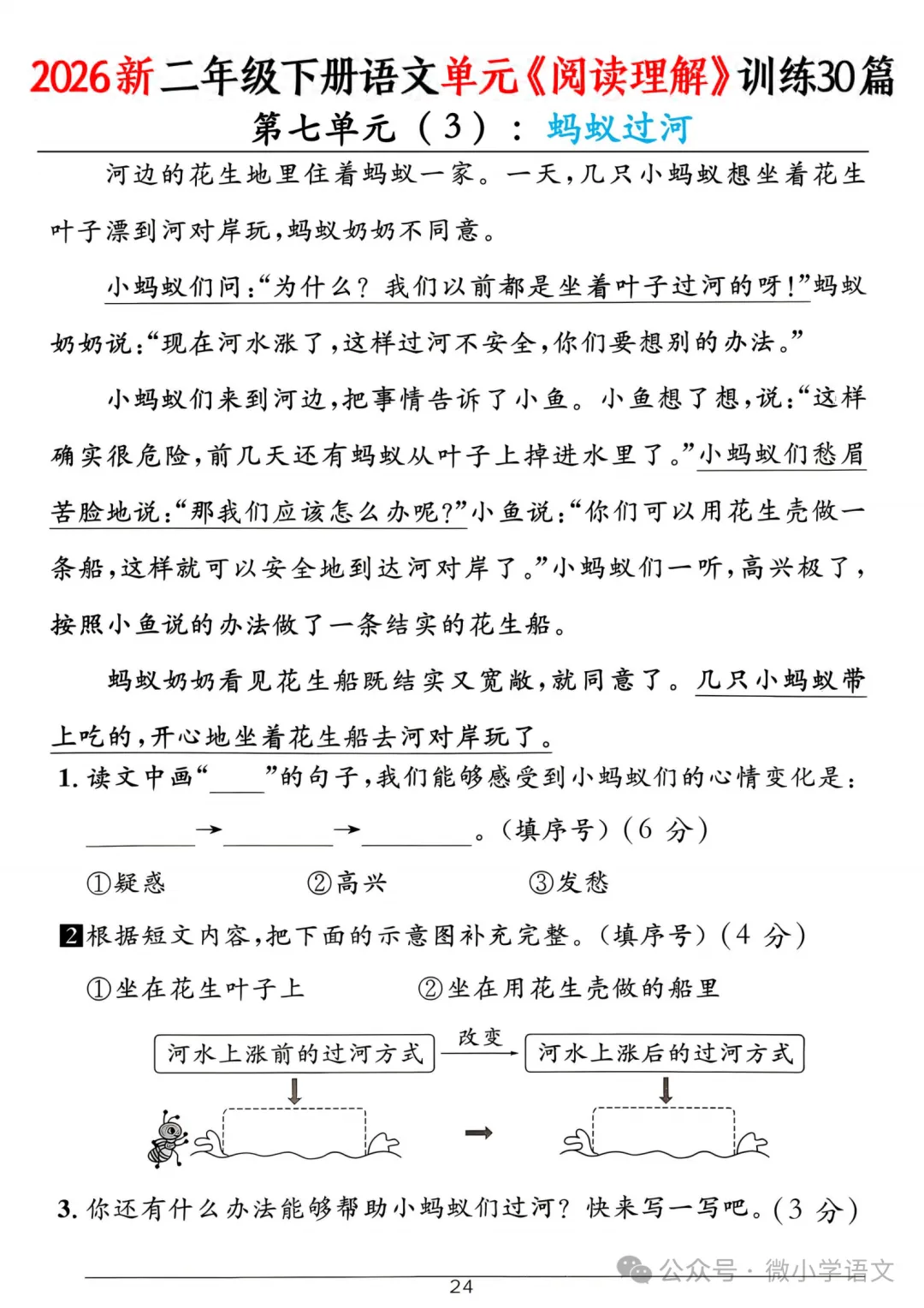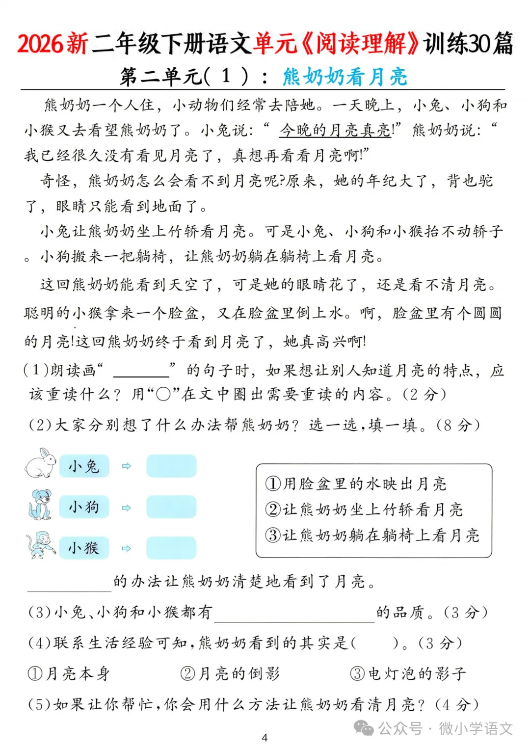26年人教新版二年级下册语文《单元阅读理解训练》,共30篇,电子版可下载,通过这份二下语文单元阅读理解练习题,帮助孩子学会从文中找答案,逐步理解短文内容,建立阅读信心,提升阅读理解能力。需要的家长抓紧打印出来,给孩子练一练吧。