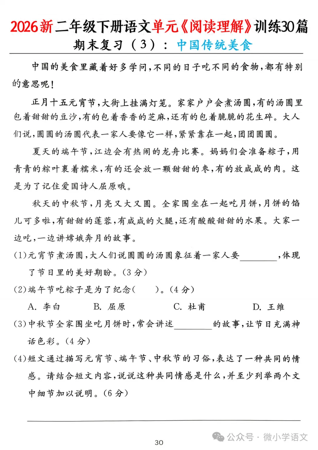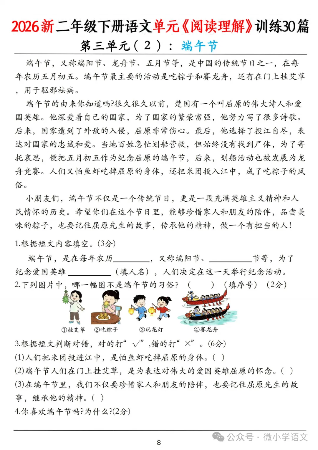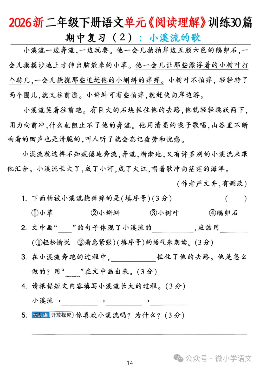 26年人教新版二年级下册语文《单元阅读理解训练》,共30篇,电子版可下载,通过这份二下语文单元阅读理解练习题,帮助孩子学会从文中找答案,逐步理解短文内容,建立阅读信心,提升阅读理解能力。需要的家长抓紧打印出来,给孩子练一练吧。