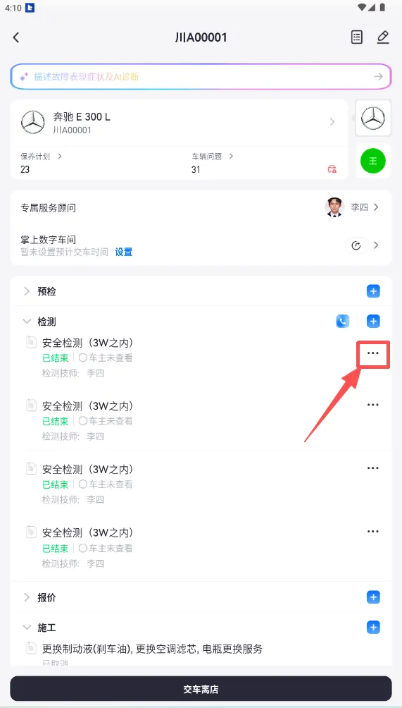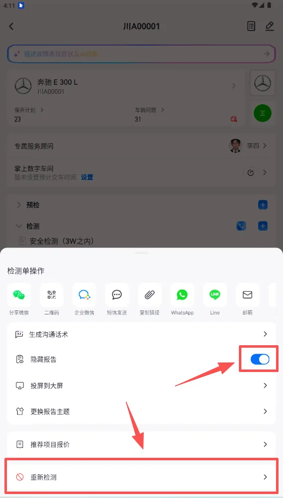 技师APP如何【重新检测】检测报告 一、打开接车单 二、找到需要重新检测的检测报告,并点击右方的【···】 三、打开“隐藏报告”按钮(目的:不让这份有误的检测报告展示在平板APP上),再点击【重新检测】 四、进入报告中,找到需要修改的地方,修改后发布报告即可。(备注:修改公里数的场景,直接发布即可)