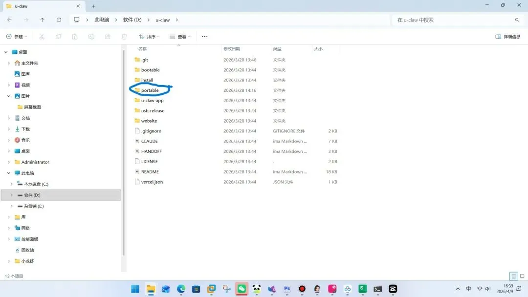 第三步:打开U-Claw文件夹下的protable的文件下Windows-Start.bat命令