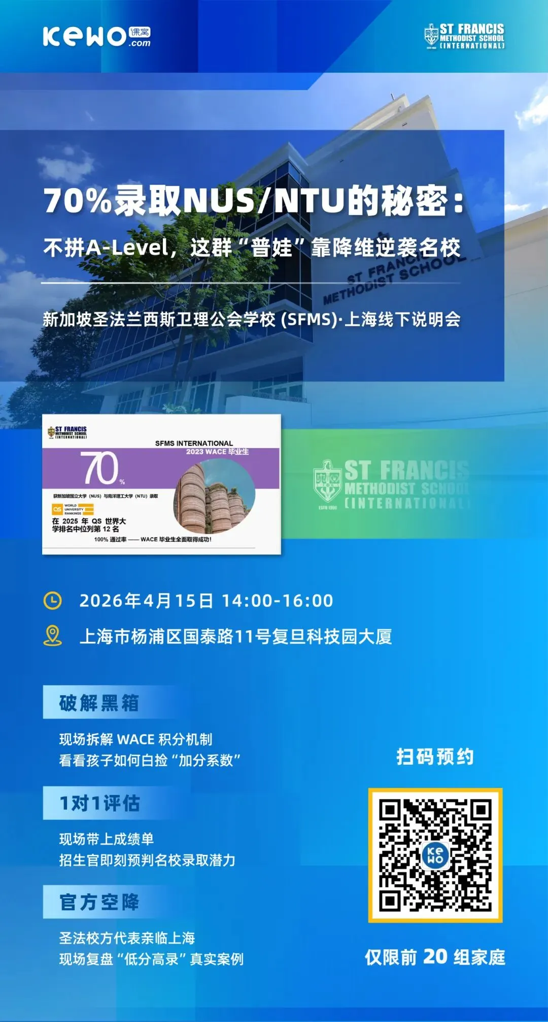 为方便家长们更深入了解新加坡圣法兰西斯卫理公会学校的课程、升学路径、入学细节,学校将于4月15日14:00 – 16:00在上海举办线下招生说明会,现场可享受专属服务,仅限20组家庭,扫码下方海报添加客服即可锁定席位。