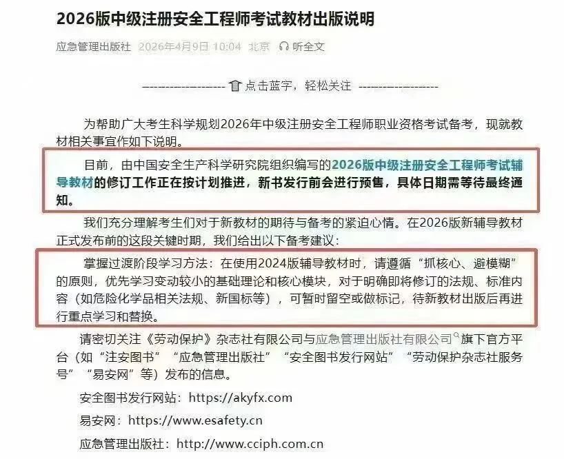 距离2026年中级注册安全工程师考试不足7个月,各位考生最关心的新教材动态终于有了官方消息!近日,应急管理出版社正式发布《2026版中级注册安全工程师考试教材出版说明》,明确了新教材的修订进度、发布时间及备考建议,为大家的备考之路指明了方向。