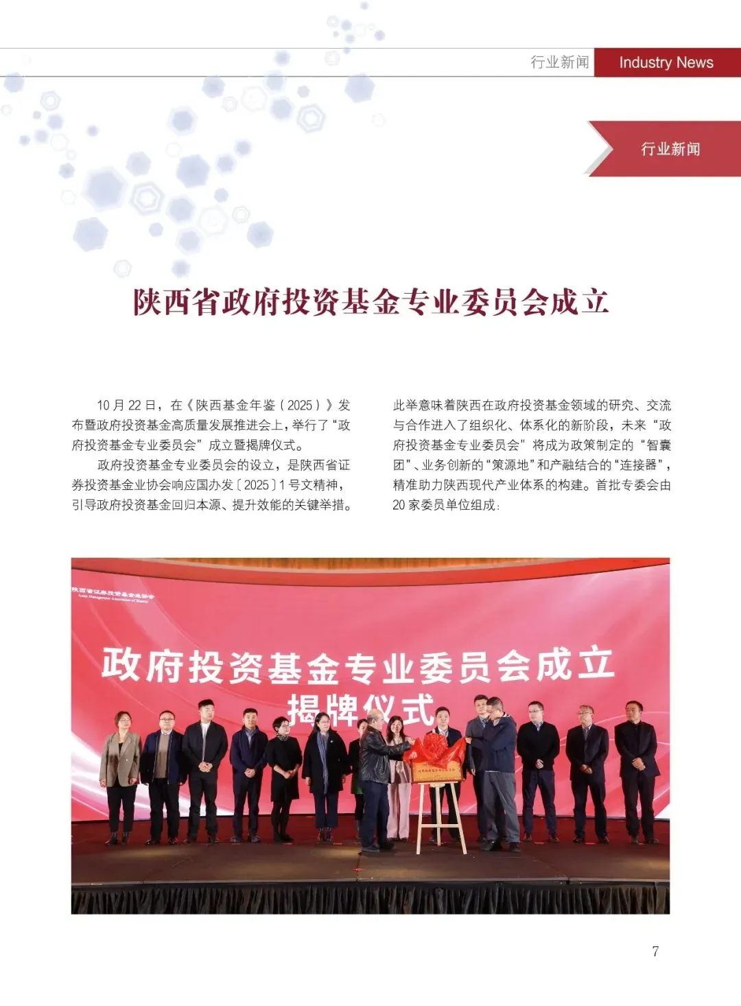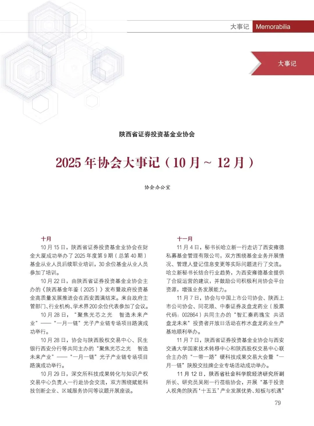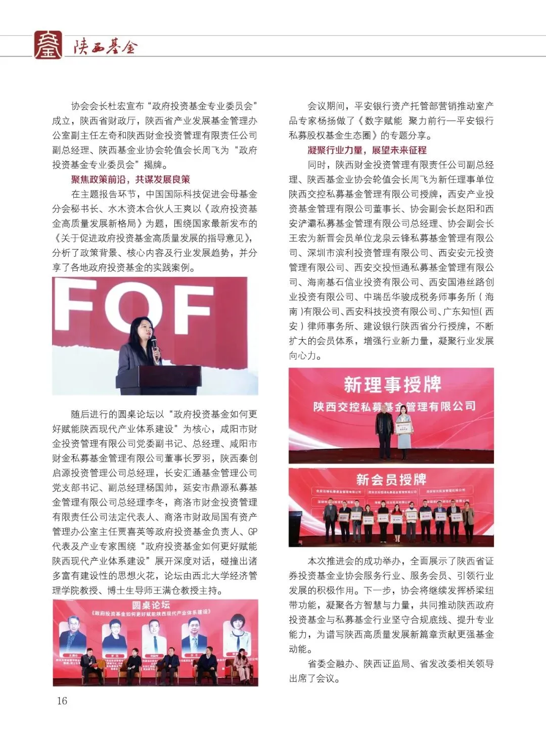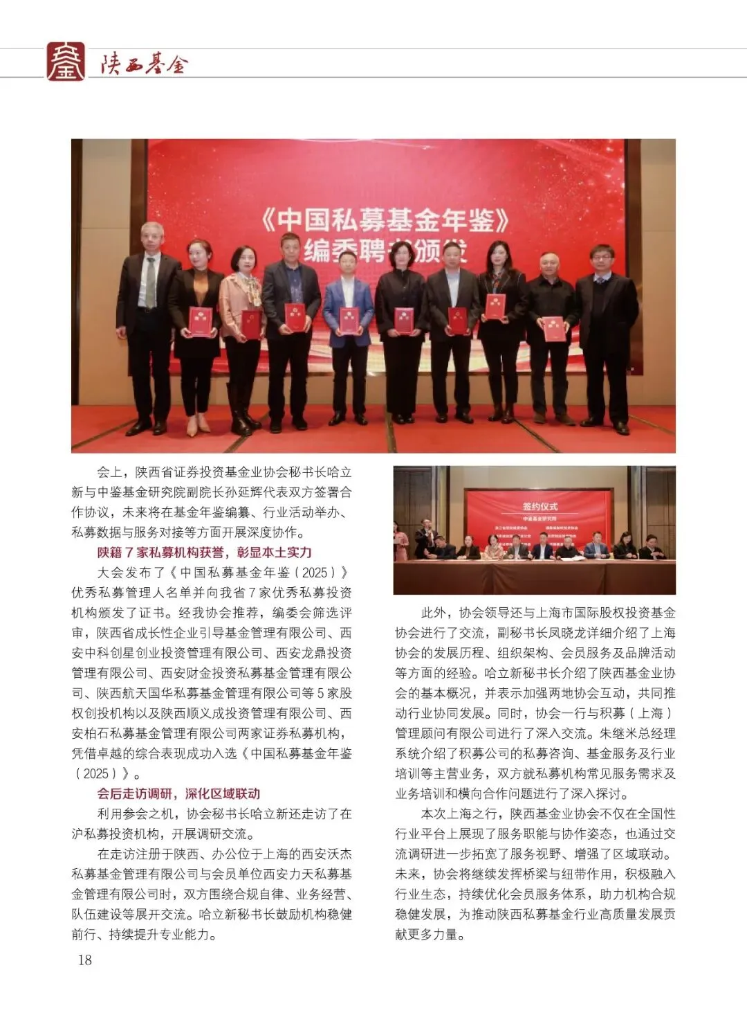 陕西省证券投资基金业协会(简称:陕西基金业协会)成立于2019年2月15日,是陕西民政厅登记的社会团体法人,陕西省3A级社会组织,是中国证券投资基金业协会的地方协会类特别会员,是接受陕西省民政厅和陕西证监局监督管理和业务指导的行业自律组织。协会以促进陕西基金业自律规范、快速稳健发展为主要目的,致力于做好组织者、服务者的角色,为会员单位搭建绿色服务通道,提供业务发展支持,促进陕西省基金产业高质量发展。