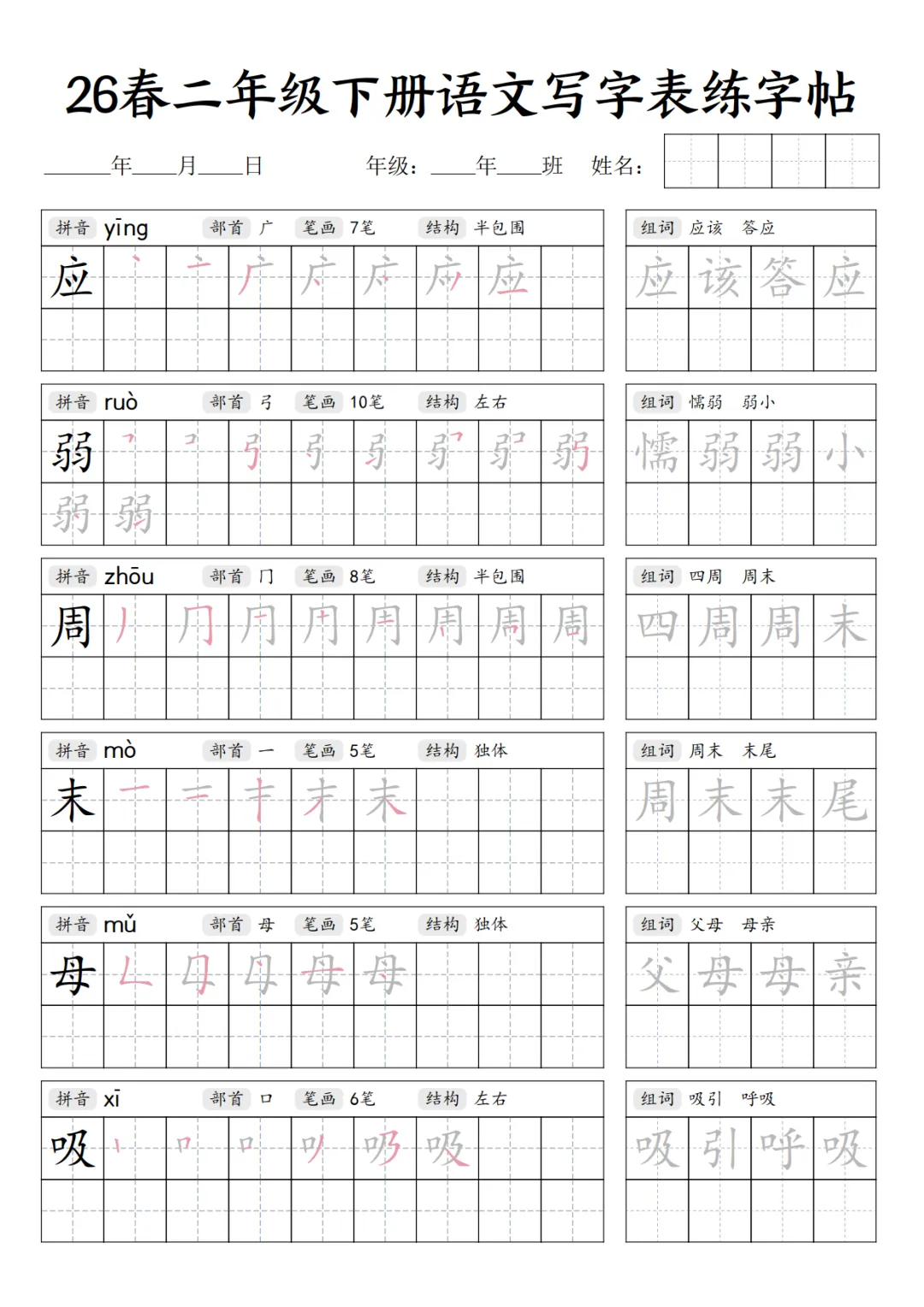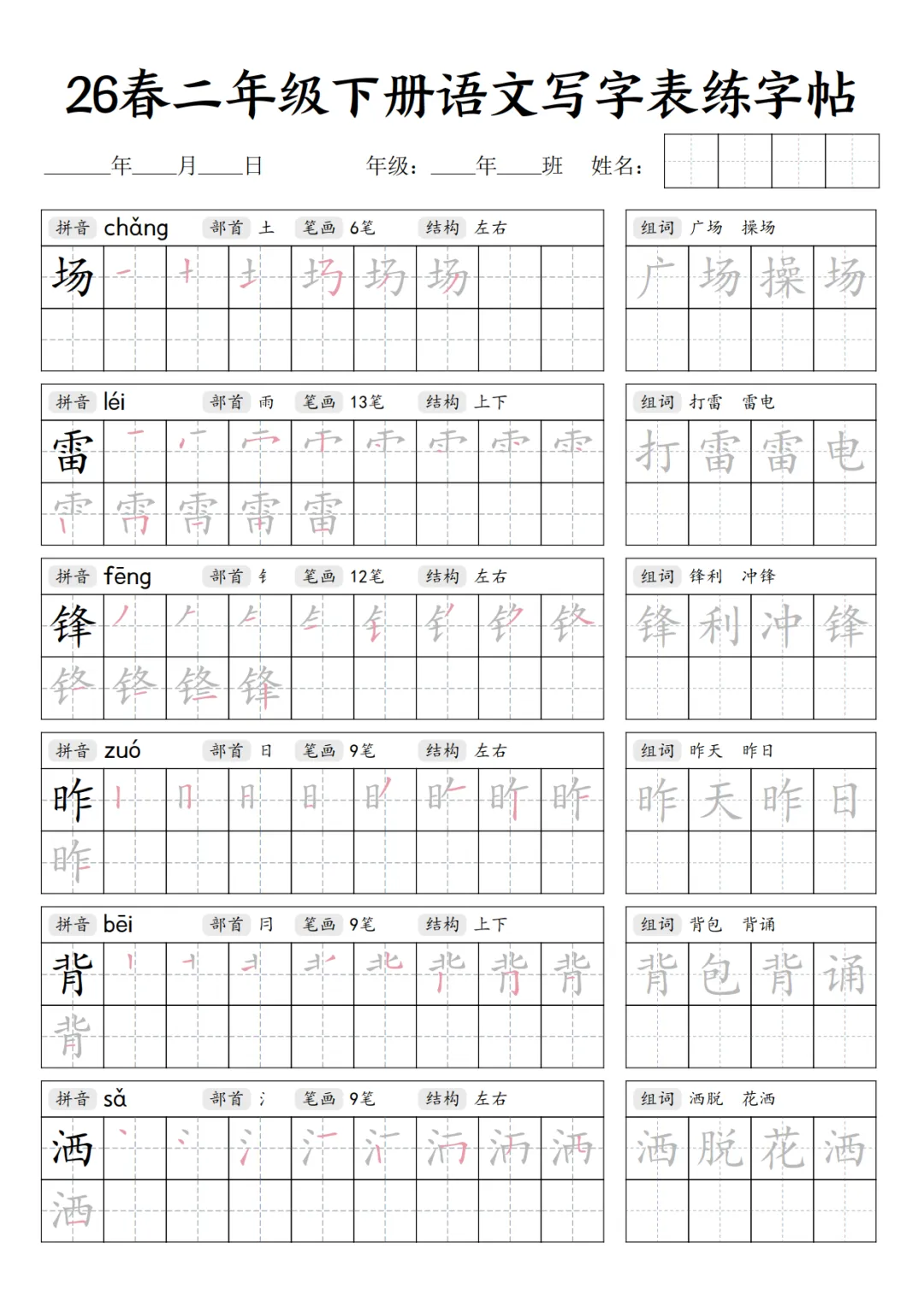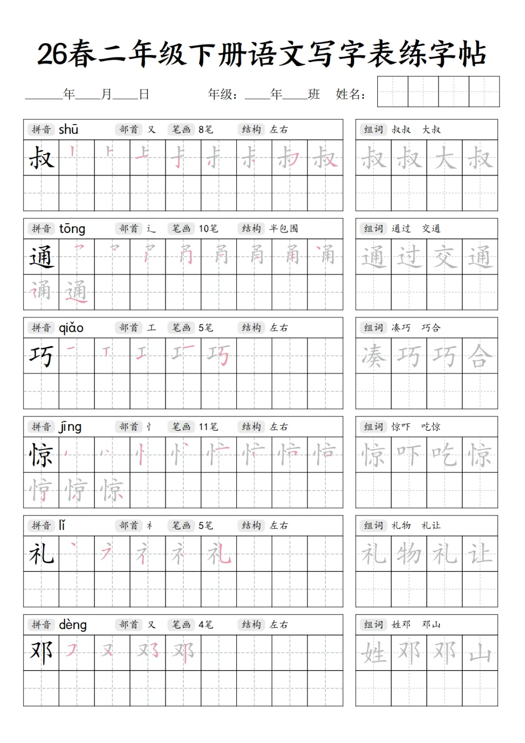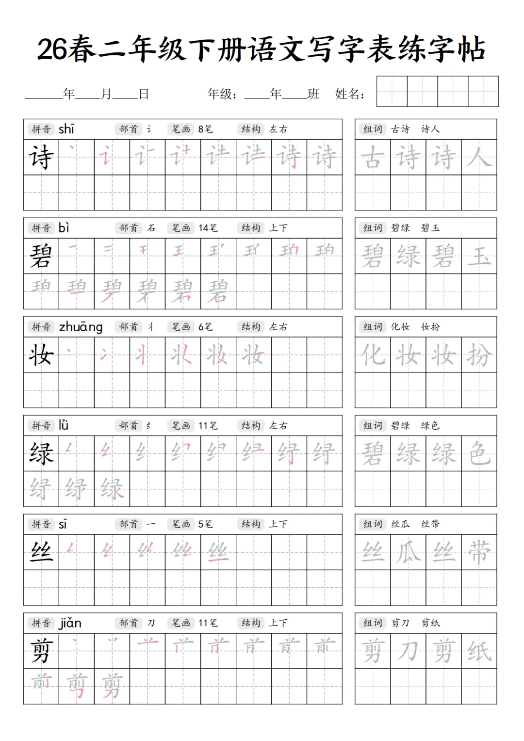 二年级下册语文写字表练字帖,电子版可打印 2026春教材已更新!课文跟读+单词听写 ↓↓↓点击图片,立即抢跑 ↓↓↓ 版面有限,不过多展示 需要直接点下方领取 完整电子打印版领取方式 ▲点击上方 儿童英语口语 在公众号消息框发送: 7675,即可领取