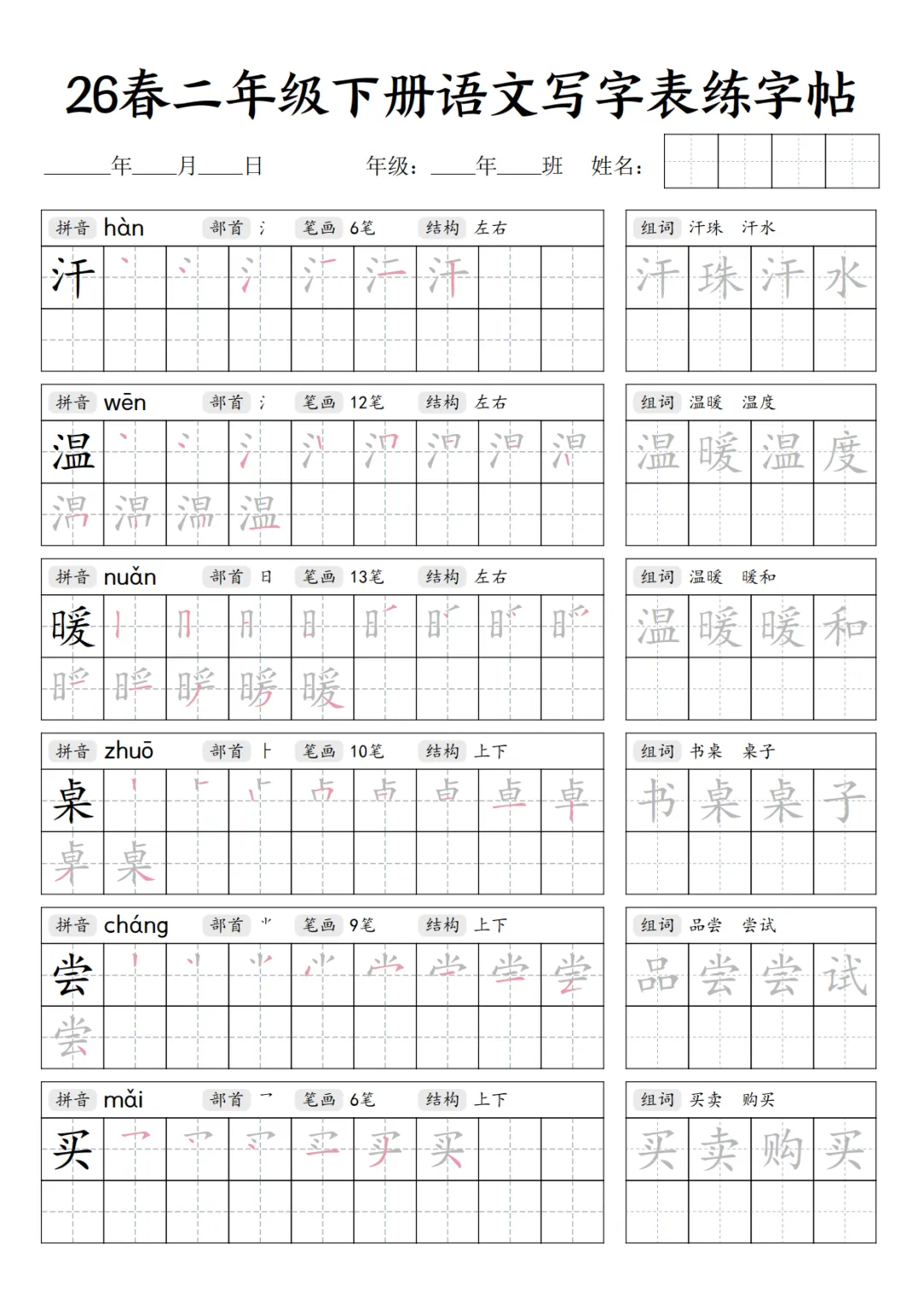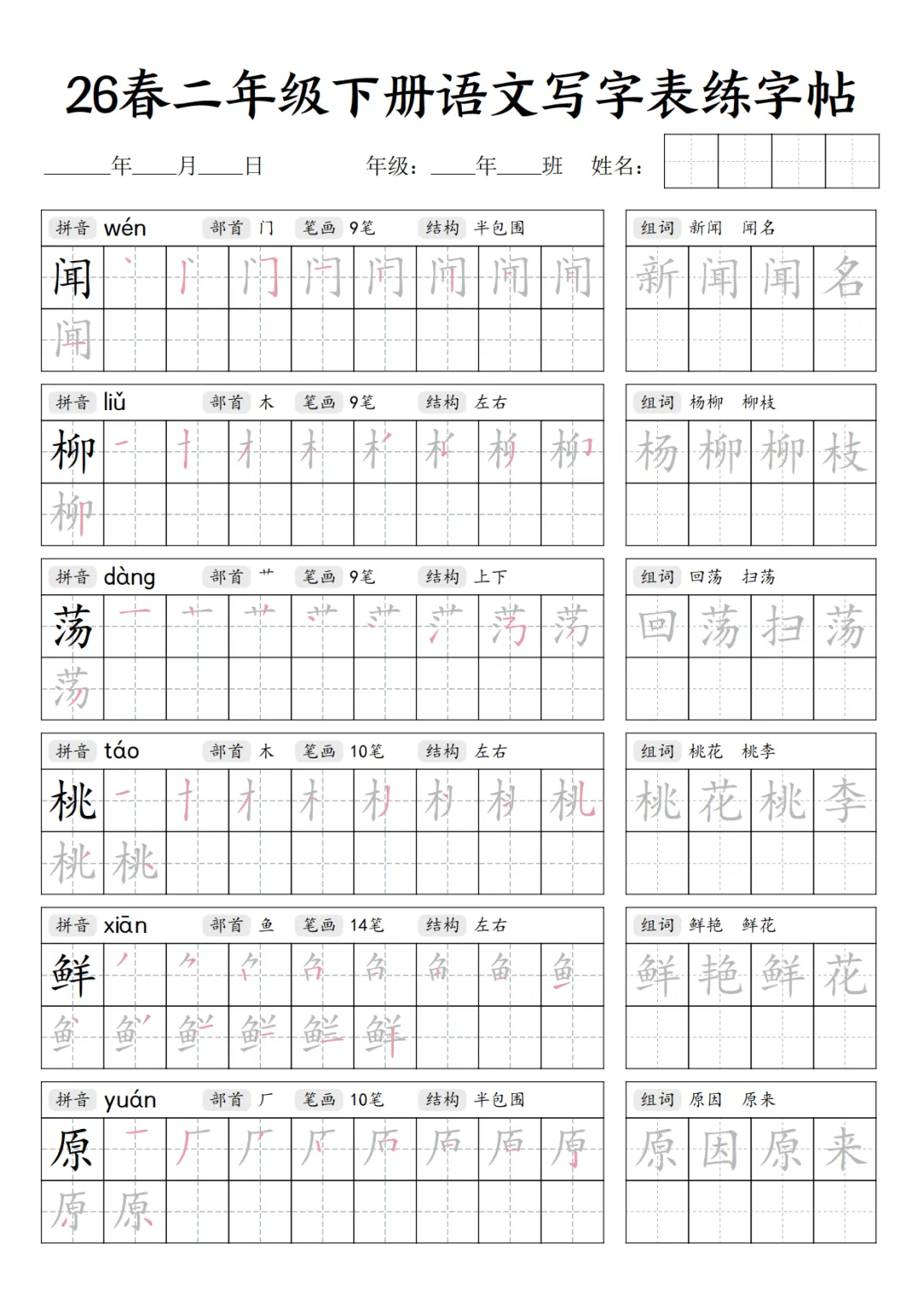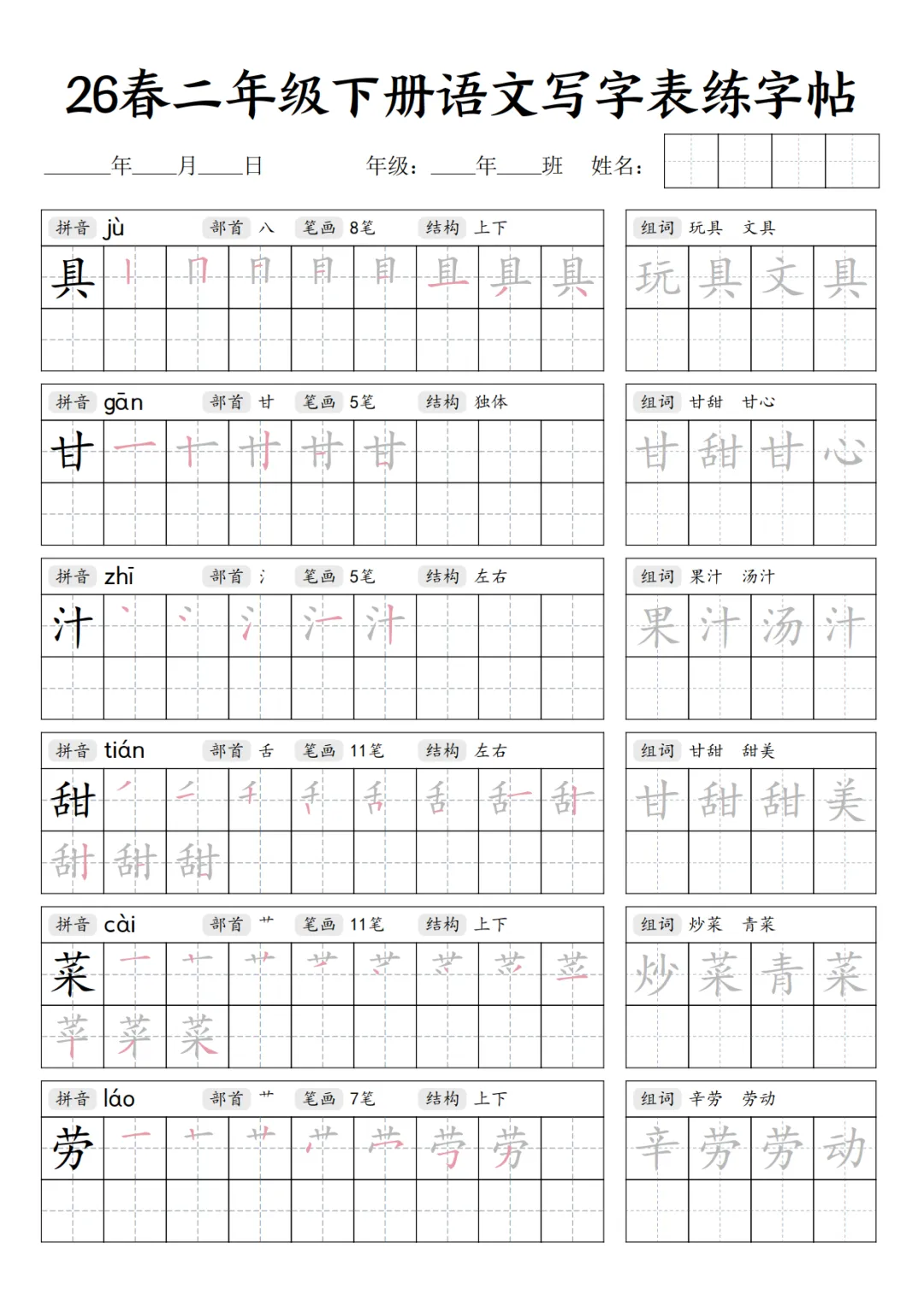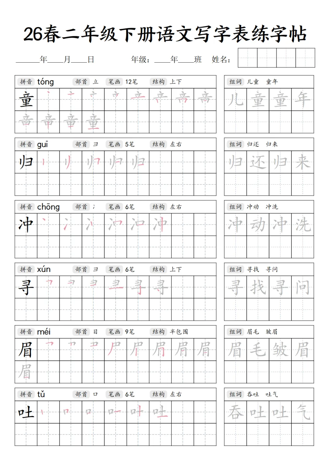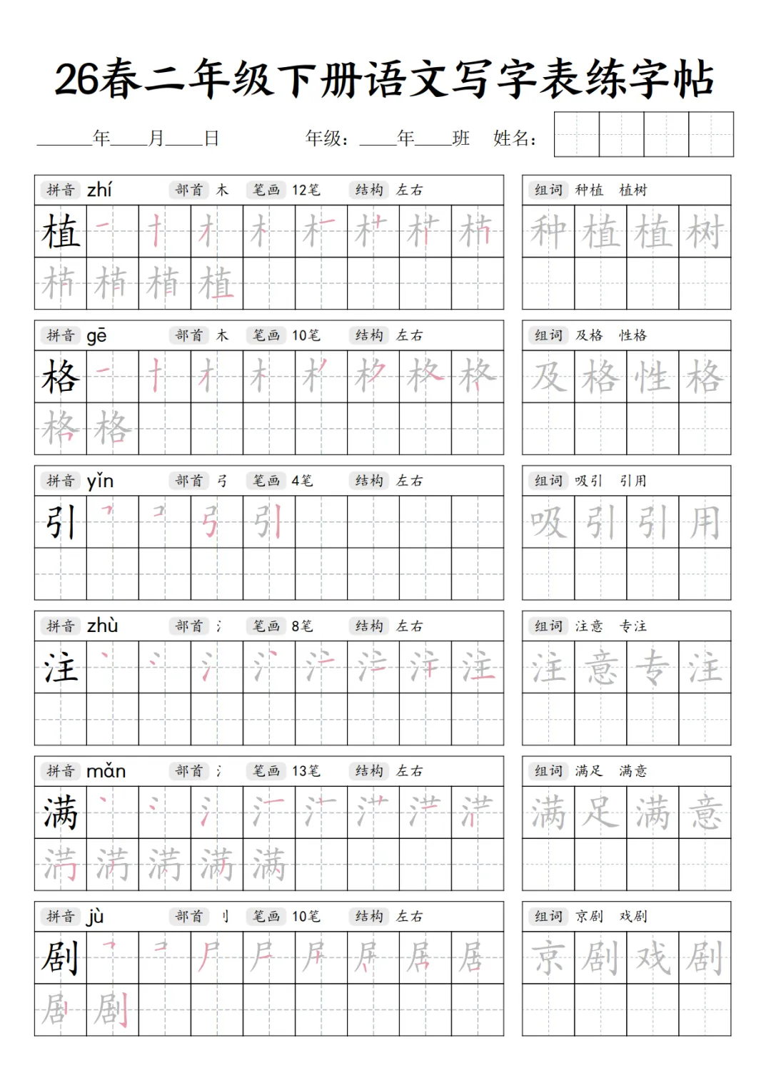 二年级下册语文写字表练字帖,电子版可打印 2026春教材已更新!课文跟读+单词听写 ↓↓↓点击图片,立即抢跑 ↓↓↓ 版面有限,不过多展示 需要直接点下方领取 完整电子打印版领取方式 ▲点击上方 儿童英语口语 在公众号消息框发送: 7675,即可领取