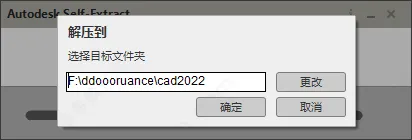 3、直接会为用户提供需要解压,软件系统会默认为C:\Autodesk\,由于小编个人安装习惯不喜欢放在c盘,因此将其放在【F:\ddoooruance\cad2022】;