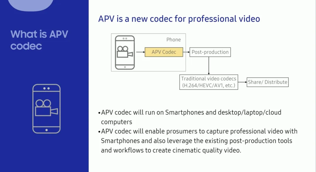 手机高规格视频录制,除了专业编码格式制定、主流后期编辑调色软件支持外,对手机SoC芯片的处理性能和闪存读写速度的要求都很高。对标ProRes编码器的安卓移动平台新一代APV(Advanced Professional Video)专业视频编码格式,同样采用10/12bit量化、422/444色彩取样、帧内压缩、高码流,但相同分辨率和帧频素材在画质相当时,体积相比ProRes降低了20%。APV与ProRes定位相同,都是拍摄制作流程中的“中间编码器”,目标是完整保留拍摄设备的最高画质,在制作过程中多次解码、编码也能保留原始质量,而非用于分享的低码流视频格式。