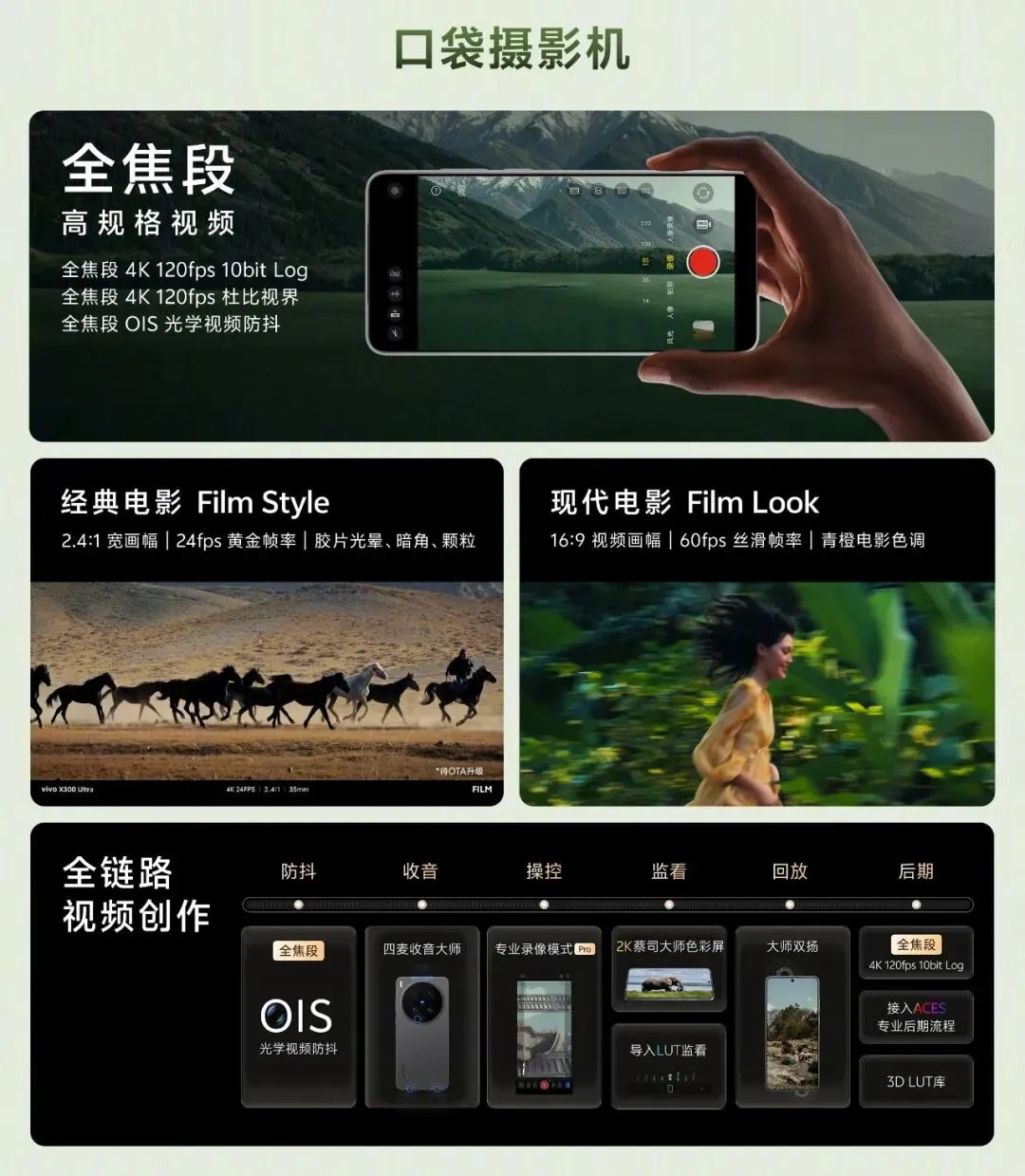 vivo X300 Ultra采用“3+2”五颗蔡司光学镜头和全焦段独家运动侦测对齐算法,提供高规格全焦段4K 120fps 10bit Log,422采样,全焦段OIS光学视频防抖,2K蔡司大师色彩屏,专业录像模式Pro,开放自定义3D LUT导入监看等,打造专业视频创作流程。在此基础上,vivo将4K 120fps Log与10bit量化深度、422色彩取样、帧内压缩、高码流的APV(Advanced Professional Video)专业视频编码格式绑定,完整记录全焦段14EV动态范围,将X300 Ultra打造为vivo首台“口袋电影摄影机”。