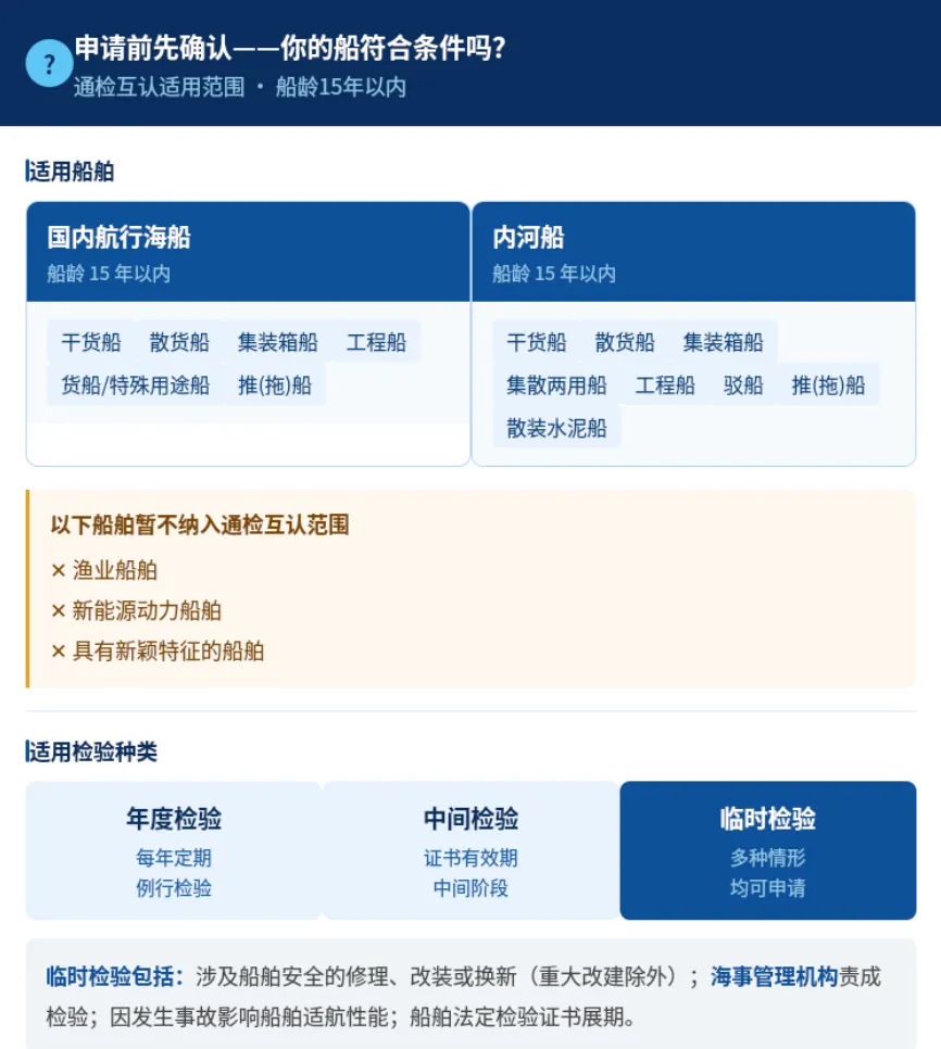 2026年1月1日,交通运输部海事局《深化长三角区域船舶检验通检互认试点实施方案》正式实施生效,沪苏浙皖籍国内航行船舶在区域内营运期间,无需返回原籍,可就近申请年度、中间及临时检验。