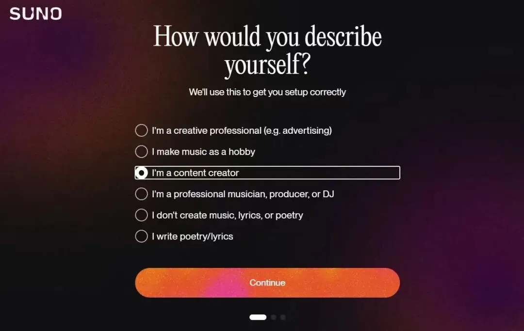 打开 Suno 后,我看到的第一屏不是创作界面,而是一道引导页: