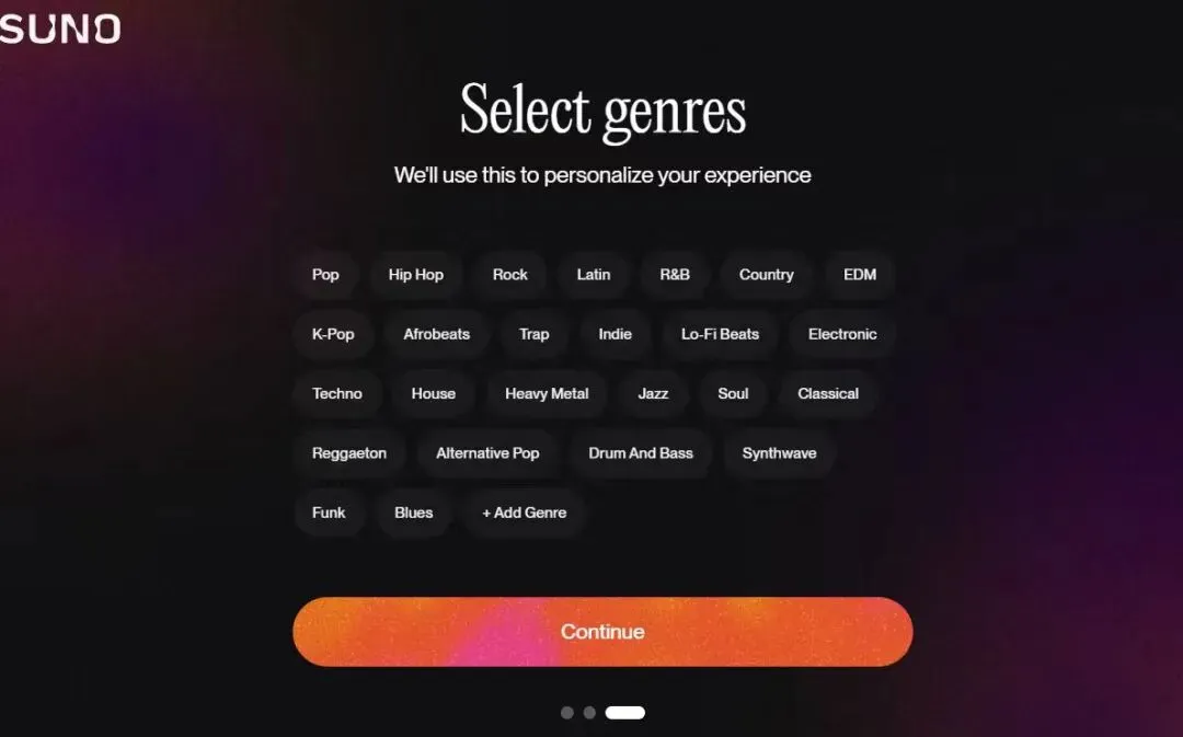 到了第三页,Suno 开始问我们喜欢什么音乐风格。