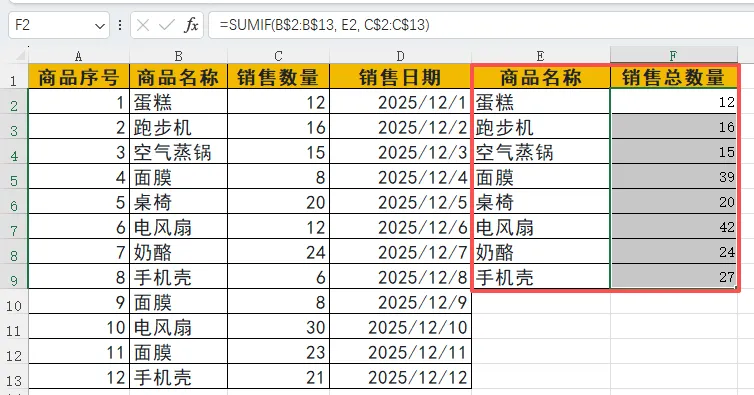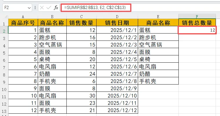 B$2:B$13:条件区域,即原始数据中的 “商品名称” 列(绝对引用,确保填充时范围不变)。