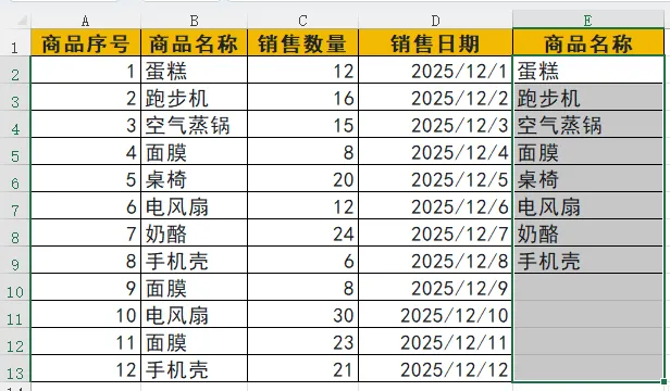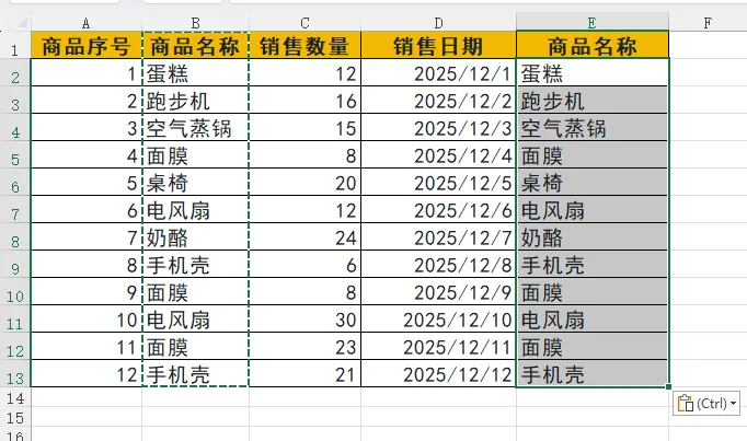 选中粘贴后的 E 列数据区域(E2:E13)。