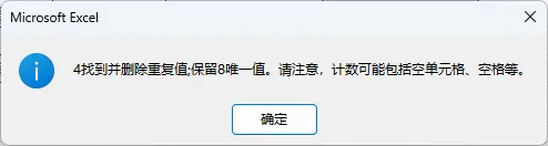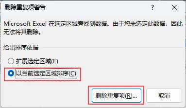 在弹出的 “删除重复项警告” 对话框中,选择【以当前选定区域排序】,单击【删除重复项】,即可得到所有不重复的商品名称。