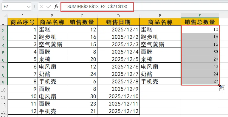 在 “销售总数量” 列的第一个单元格(F2)中,输入核心公式: