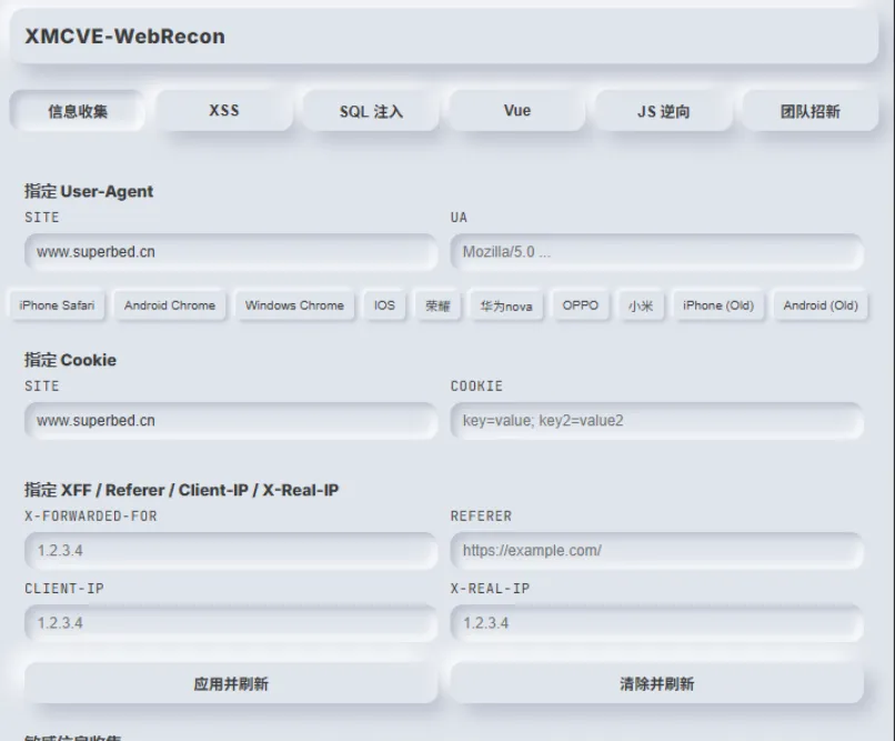 信息收集:按需执行 UA 切换、敏感信息嗅探、指纹/蜜罐识别、Fuzz 探测