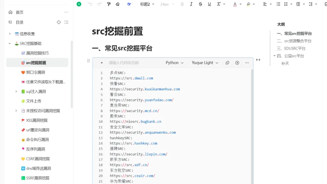 1、src挖掘思维导图,信息收集思维导图,edusrc挖掘思维导图,以及后续的红队&面试思维导图&自己网安笔记等持续更新2、2025-2026的edusrc实战报告包含证书站和非证书站以及2025之前的各种优质报思路分享3、各种src报告思路分享(内部&外部)4、分享各种src挖掘&edusrc挖掘培训资料&视频5、不定期分享通杀、0day6、有圈子群可以技术交流以及不定期抽取证书&免费rank7.分享各种护网资料各家安全厂商讲解视频&精选实战面试题目8、各种框架漏洞技巧分享9、各种源码分享(泛微、正方系统、用友等)10、漏洞挖掘工具&信息收集工具&内网渗透免杀等网安工具分享11、各种ctf资料以及题目分享12、cnvd挖掘技巧&CNVD资产&src资产分享&补天1权重资产分享&fofakey共用13、免杀、逆向、红队攻内网防渗透等课程分享14、漏洞库&字典以各种内容不在一一说明15、cisp-pte/pts&nisp一级&nisp二级&edusrc证书内部价格15、如果有漏洞挖掘问题或者工具资料需求可以找群主(尽量满足)