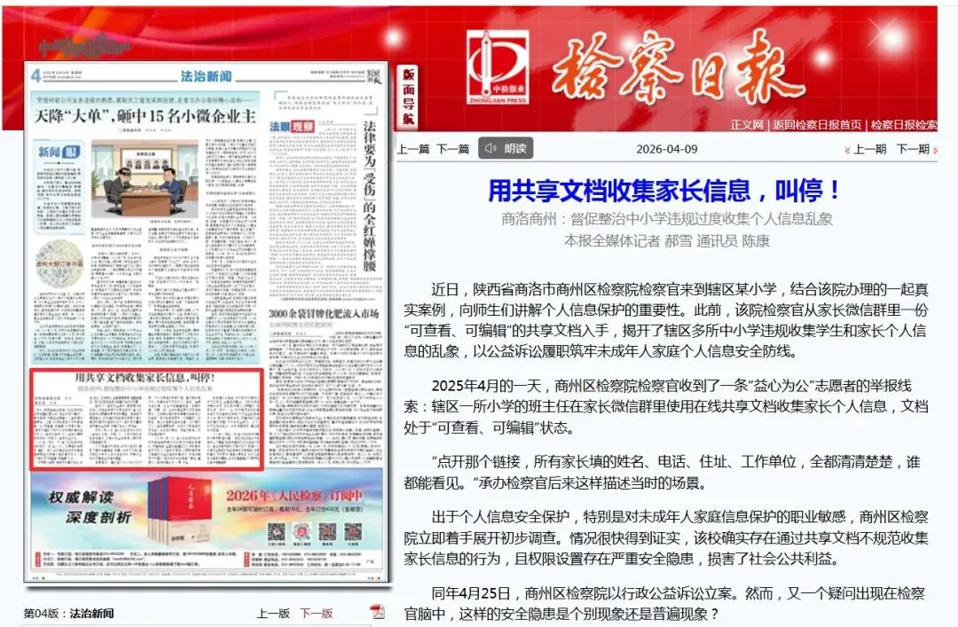 2025年9月15日,商州区检察院依法向负有监管职责的行政机关发出检察建议,明确提出,全面排查辖区中小学收集学生及家长个人信息的情况;立即叫停共享文档等不安全的信息收集行为,并通过规范方式替代;压实学校与主管部门责任,确保个人信息收集合法、必要、安全。