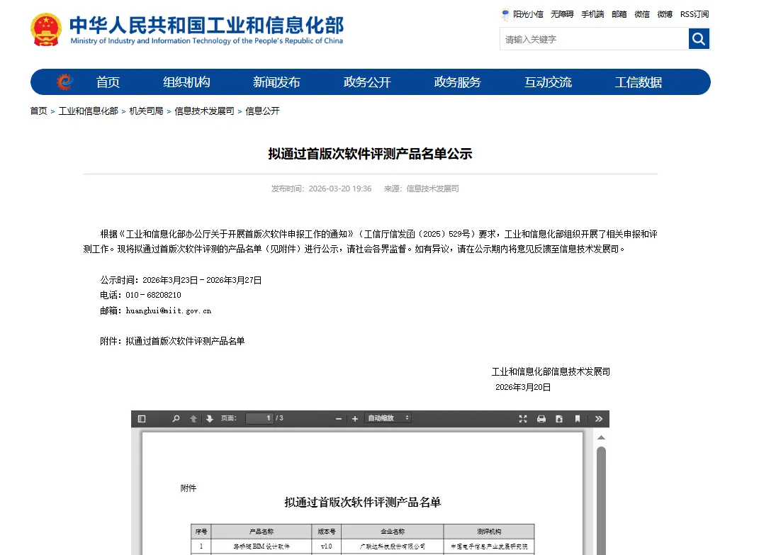近日,工业和信息化部信息技术发展司公布《拟通过首版次软件评测产品名单》, 广联达自主研发的路桥隧 BIM 设计软件 V1.0(数维基建设计软件)成功通过首版次软件评测,正式入选工信部首版次软件评测名录。