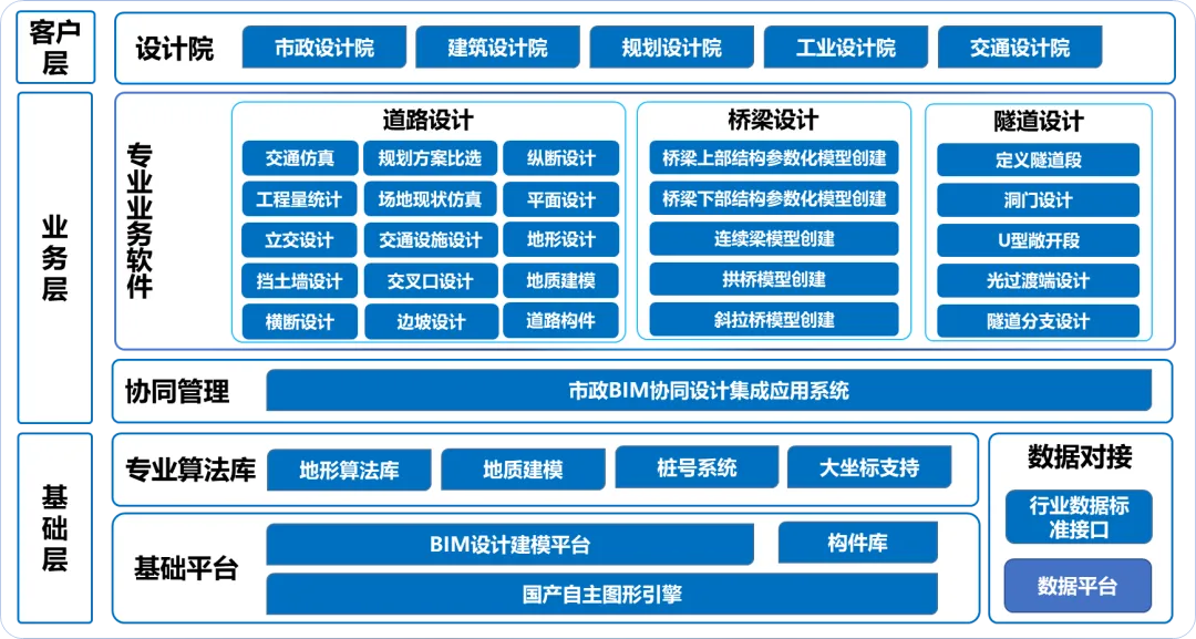 广联达“路桥隧 BIM 设计软件”,依托完全自主知识产权的国产广联达 BIM 设计建模平台打造,专为路桥隧设计师研发。产品聚焦路线、桥梁、隧道方案设计与施工图设计,贴合国内设计习惯及行业规范标准,实现一体化专业 BIM 设计。软件包含道路、桥梁、隧道三个子系统,各子系统之间无缝协同,数据完全互通,且具备高度协同性。目前该产品的最新迭代版本“广联达数维道路设计软件 V3.0”系列产品已经在33个省市、1200家设计单位、3000多个生产性项目中得到全面应用验证,方案能够满足复杂路桥隧多专业一体的工程从方案到施工图的设计。