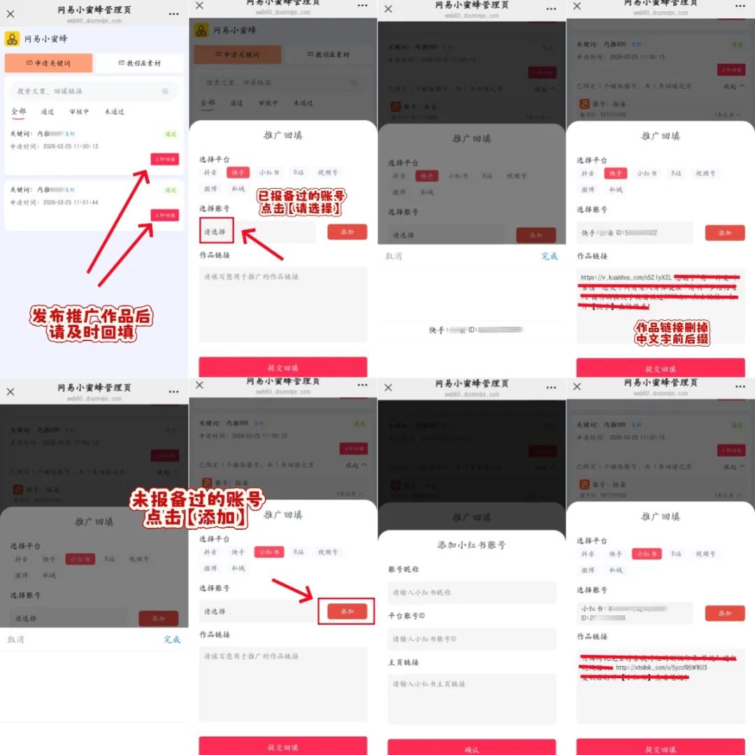 在抖音、快手、小红书、B站、微博、知乎等社交平台发布笔记后,及时在推广平台回填链接,操作如下图。