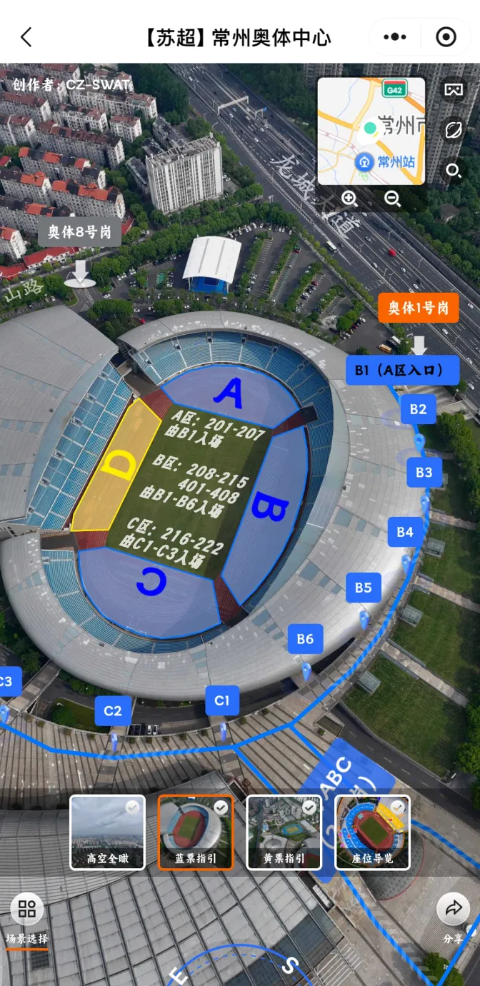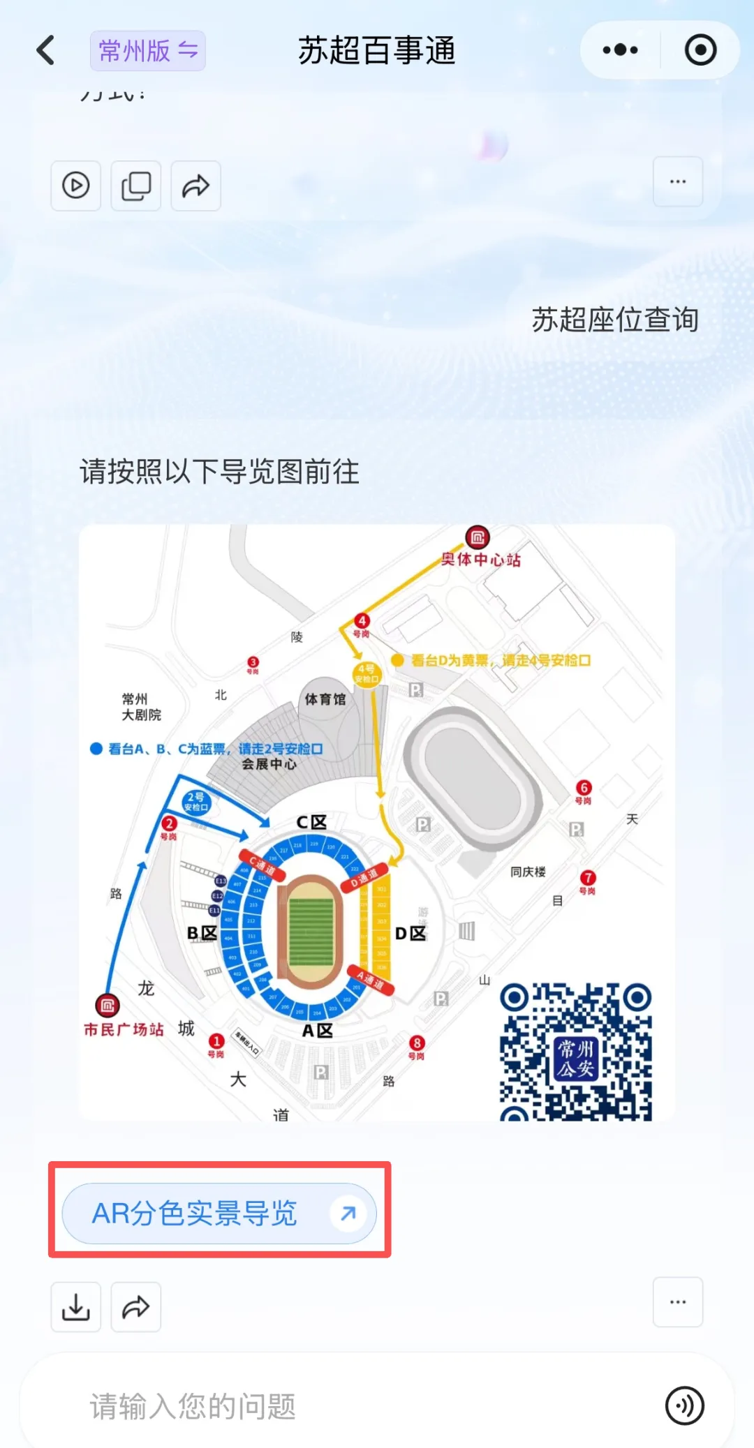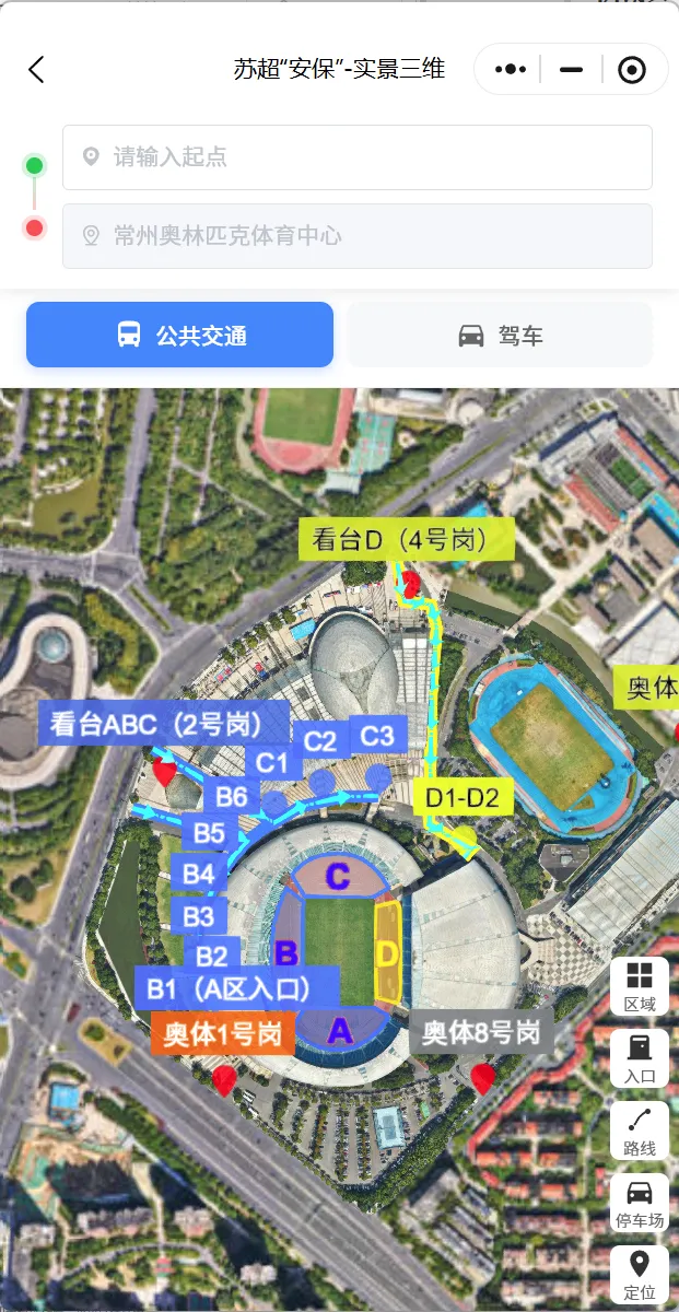为方便观众找场馆、找安检口、找座位,常州公安专门为常州奥体中心建立AR分色实景导览,全面覆盖从进场到入座全流程,让球迷不用问路、不绕路、不找错。