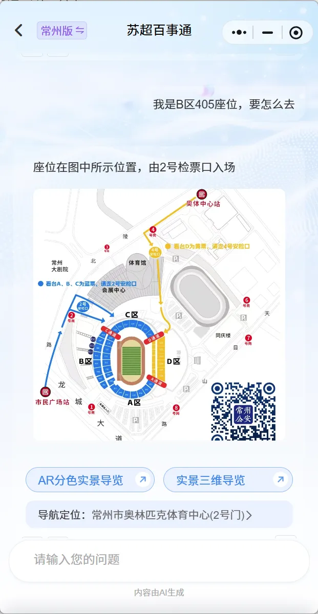 球迷只需在“苏超百事通”小程序内输入座位信息,即可一键获取分色导览路线,点击“AR分色实景导览”,即可开启实景导航,全程跟随指引直达座位。