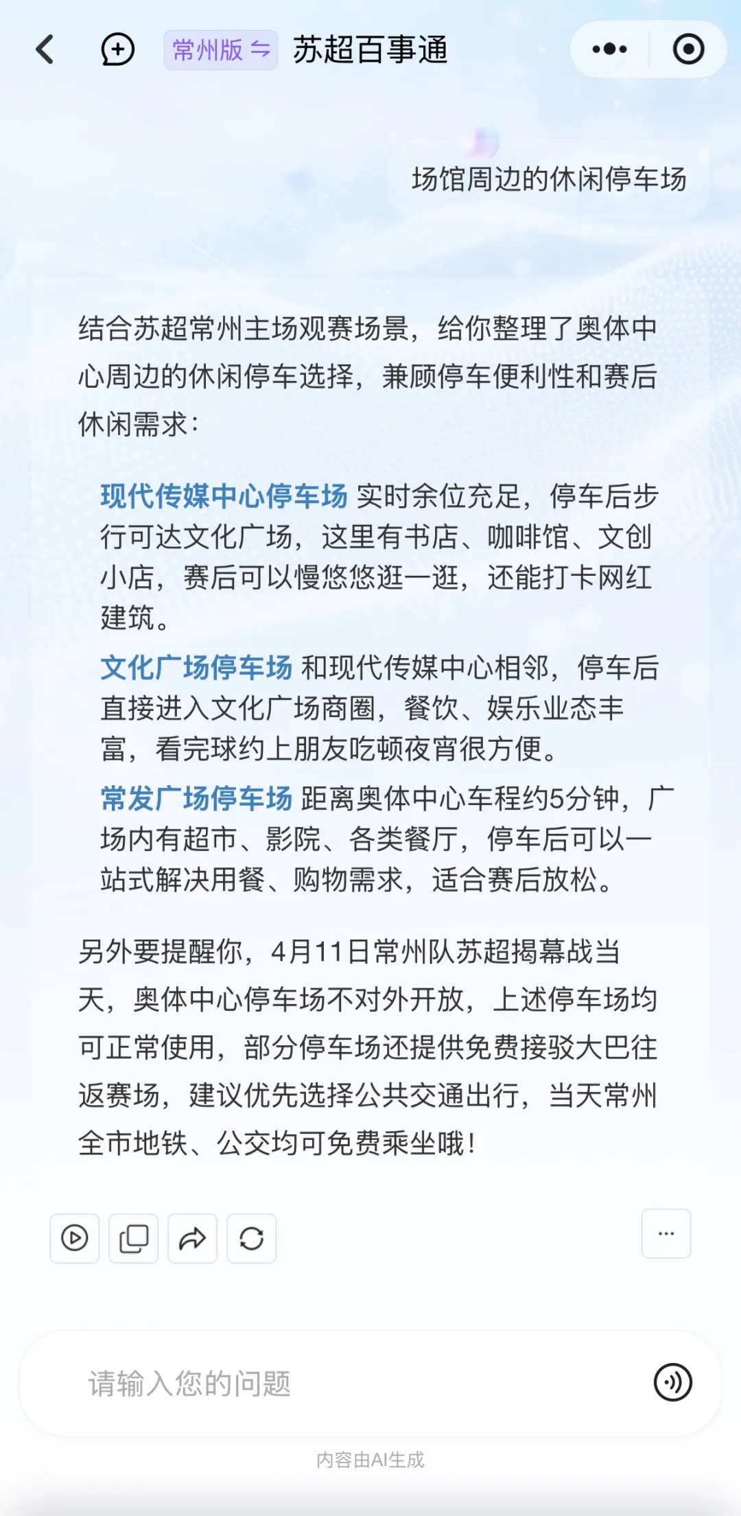 “苏超百事通”不用下载APP、全场景贴心服务,解决找路、找座、找车位等难题,让每一位远道而来的观众沉浸式感受苏超赛事的热血激情与龙城常州的独特魅力。
