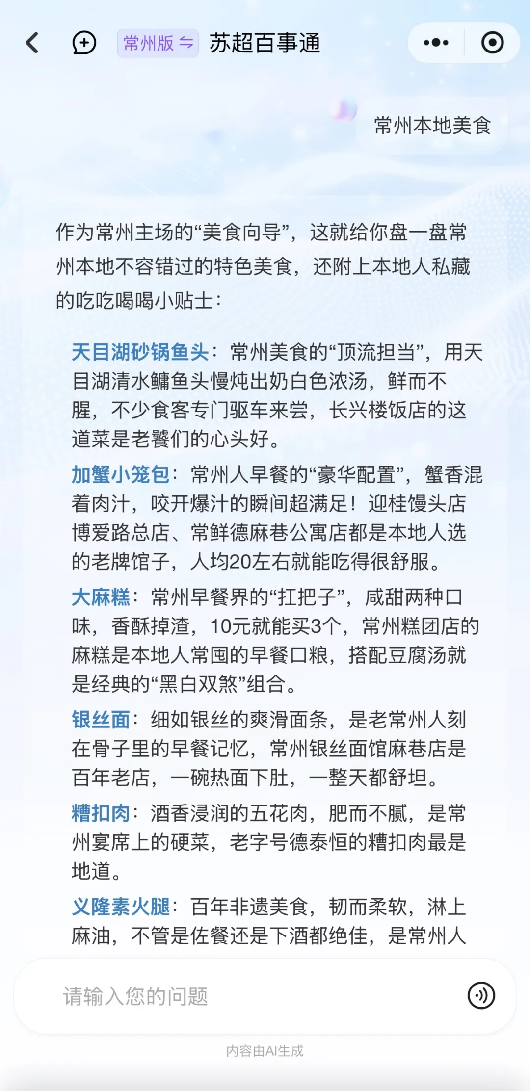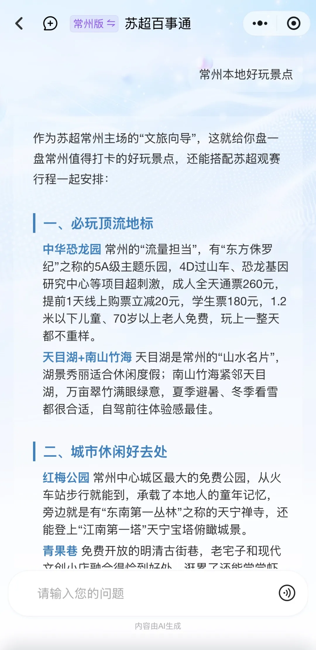 “苏超百事通”不仅是观赛助手,更是球迷的“常州本地生活向导”,一站式覆盖美食、文旅全场景需求,让球迷看完球轻松玩转常州,发现这座城市的更多精彩。