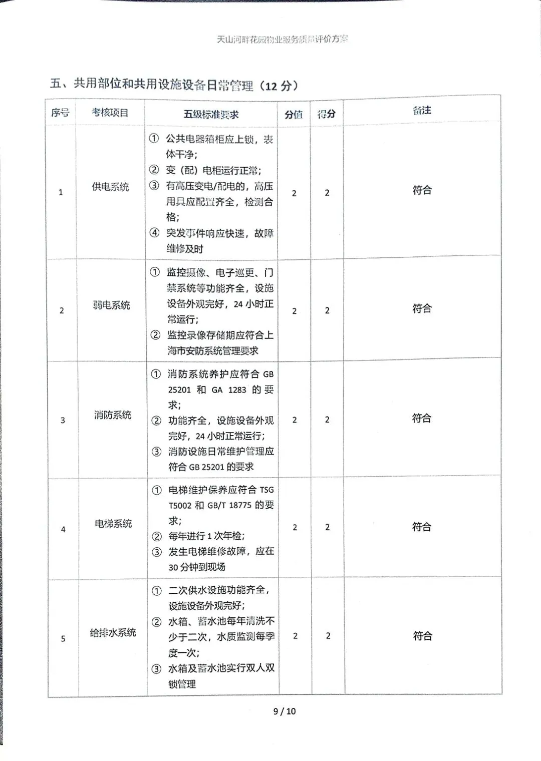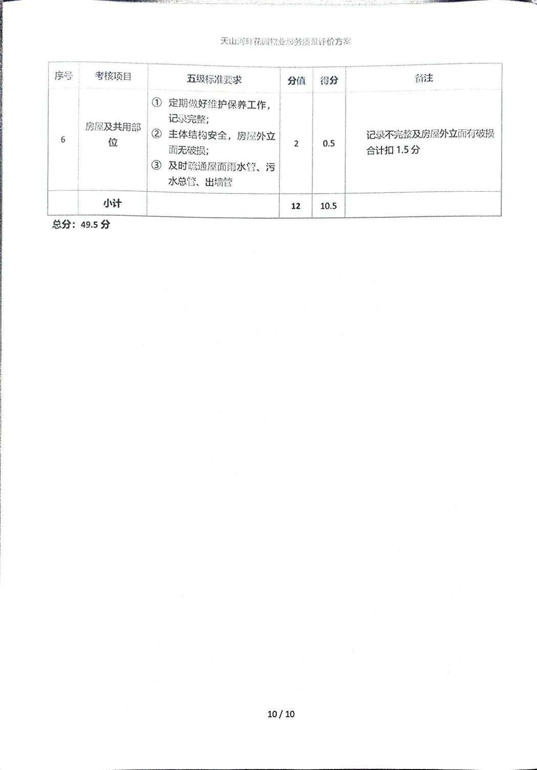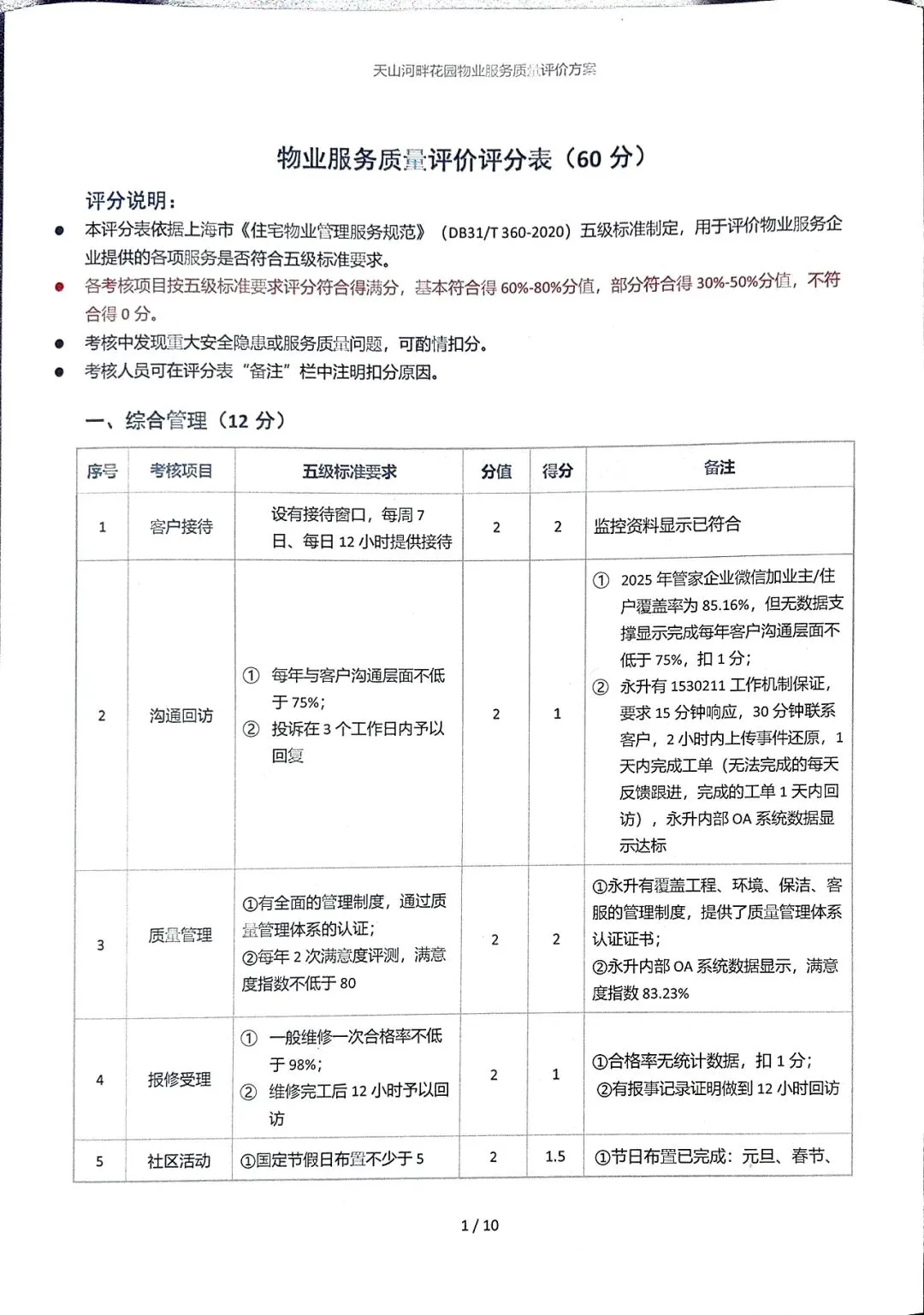 在2025年度物业服务满意度调查开展期间,业委会全体成员依据上海市《住宅物业管理服务规范》(DB31/T 360-2020)五级标准,对物业2025年度各项工作进行了检查和评分。评分按五级标准要求,符合得满分,基本符合得60%-80%分值,部分符合得30%-50%分值,不符合得0分。物业2025年服务质量评价得分:49.5分(满分60分)。