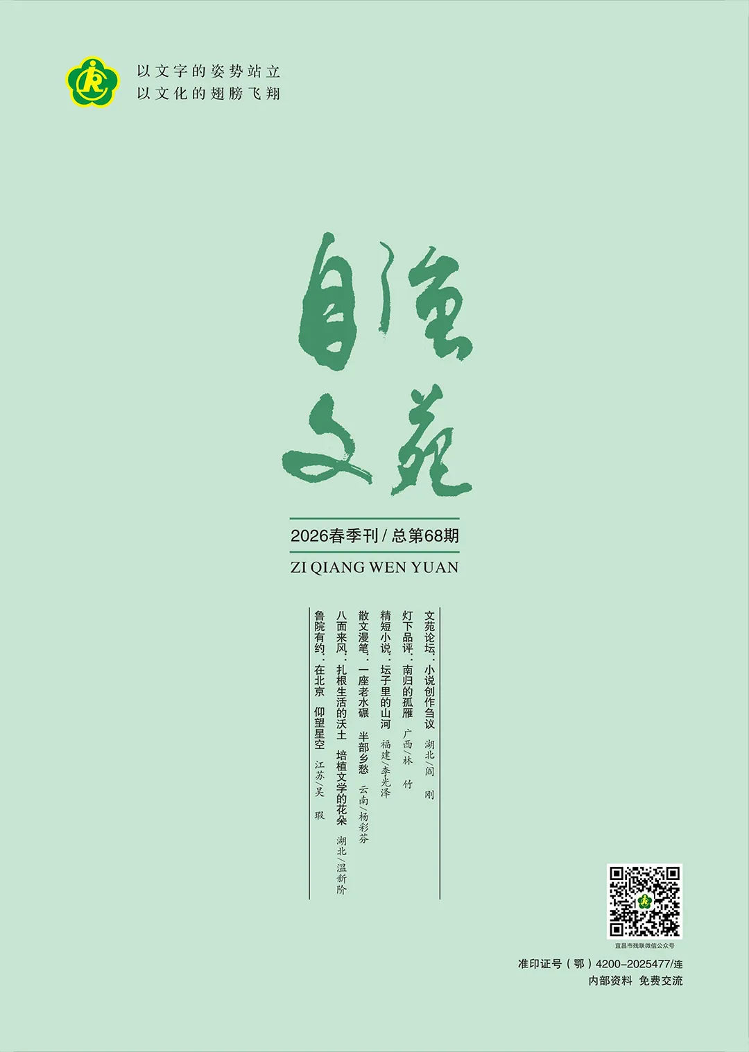 “以文字的姿势站立,以文化的翅膀飞翔。”《自强文苑》(季刊)由湖北省宜昌市残疾人文学艺术协会主办,2009年创刊。是湖北省宜昌市残疾人文学艺术协会会刊,也是全国首份残疾人纯文学期刊。自面世以来,得到了社会的充分肯定,我们真诚地期待您的持续关注与支持。