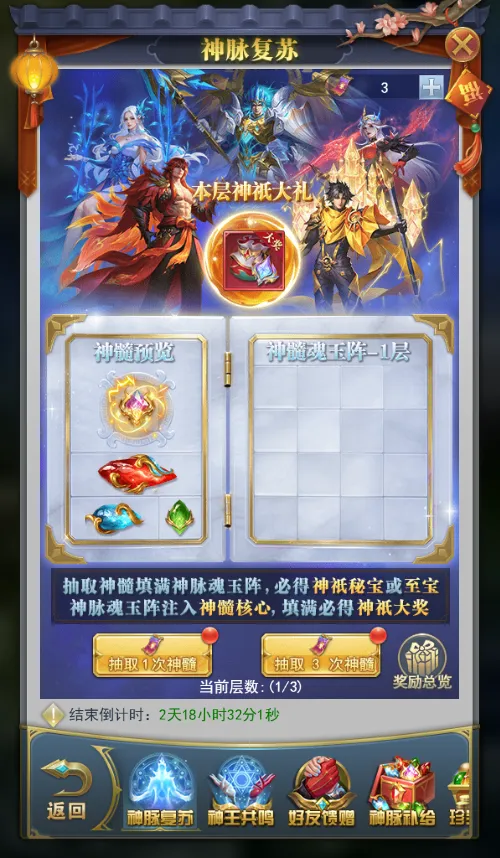获得神祇大礼–血脉神华后,将开启下一层奖池,本期共有3层奖池。