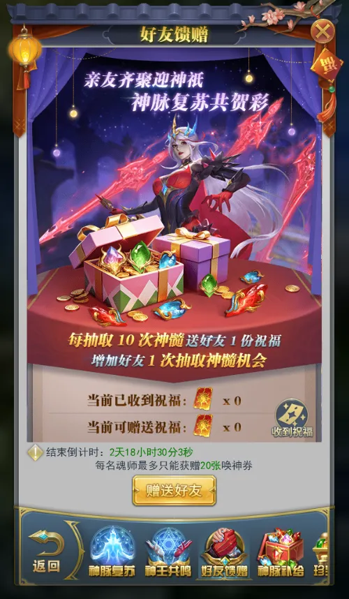 活动期间,每进行10次抽取,可赠送好友1张唤神券。