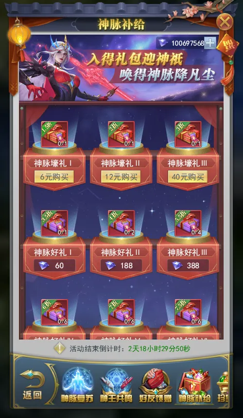 活动期间,可在神脉补给中购买礼包获得大量唤神券,助力神脉复苏。