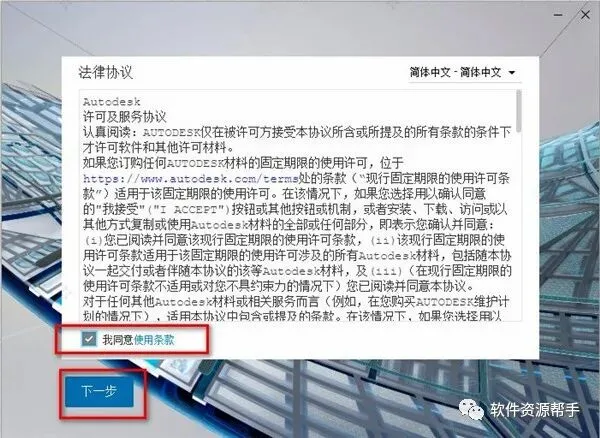 3、勾选我同意使用条款,点击下一步;